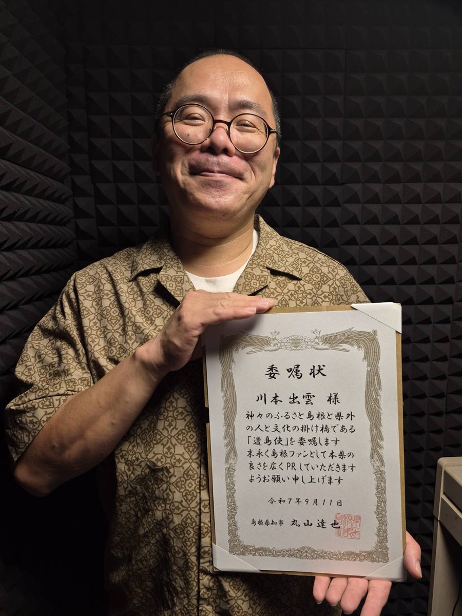 今回もご視聴ありがとうございました🌃📻というわけで『遣島使』就任でございます😀✨これからもラジオで島根県の話題を出して行きますので是非ともお聴きください💪✨ 来週もお楽しみに~😁 #調布FM #ラフチャ #相州雅屋 #橘相模守 #劇団MarchWind #川本出雲 #楠木英瑠 #遣島使 pic.x.com/d0uSl7ak41