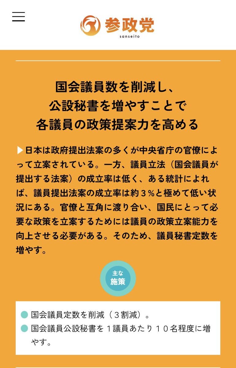 返信先:@saitama_5992さいたまさん、あえて言う 参政党は議員定数削減(3割)を政策カタログ2025に載せてますよ。 比例代表定数の削減は新興政党の勢いを削ぐのは間違いないので、そのあたりをどう考えているのかは、参政党としてはっきりしておくべきことかと思います。 pic.x.com/BCtt12HQeB