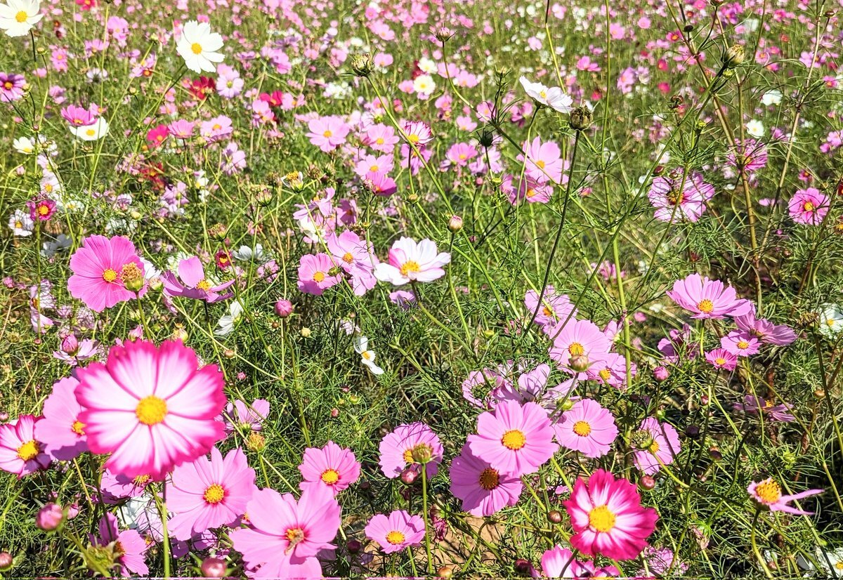 チャリとばす きみ残す歌 あきざくら (横浜の追分市民の森には1万本のコスモス。下校する男子高生が大声で歌いながら畑横の道を自転車で走り抜けていきました。)