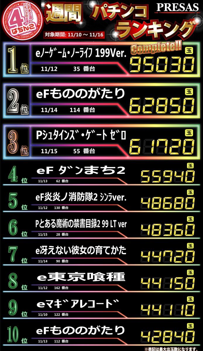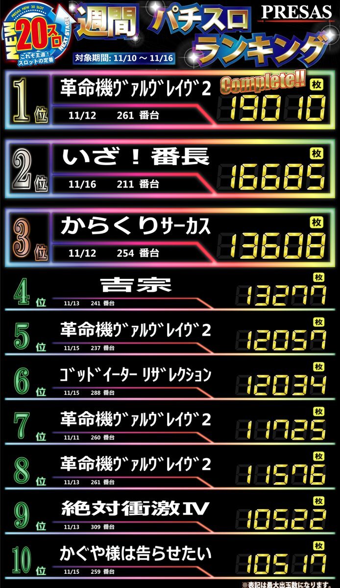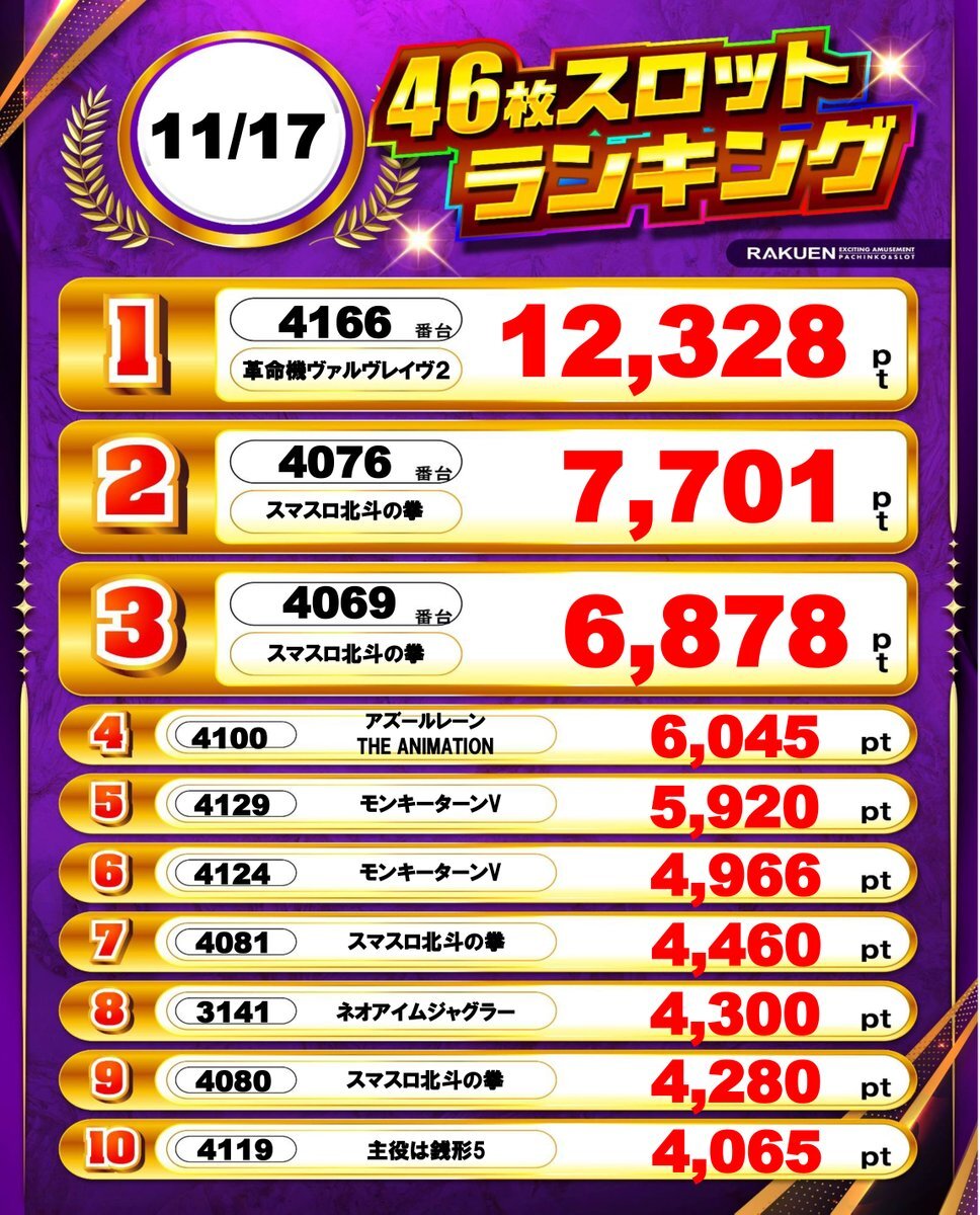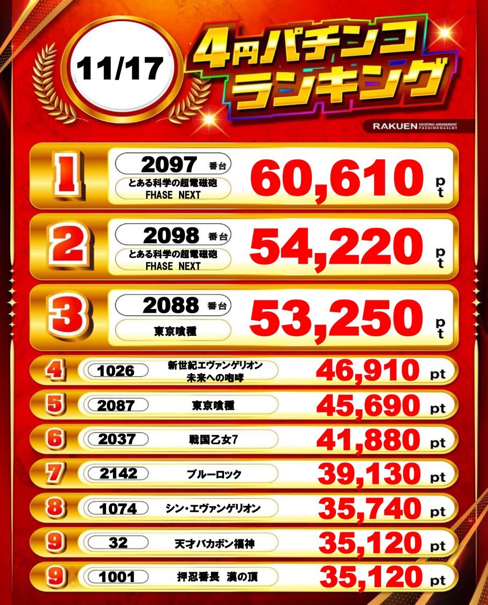 おはようございます☀️ 昨日11月17日(月)の デイリーランキングです🏆🎉 TOPは… 😍✨ P⇒とある科学の超電磁砲 FHASE NEXT S⇒革命機ヴァルヴレイヴ 本日導入の最新台から 定番の人気機種まで幅広くランクイン🤩 本日も‼️ この後10:00開店です💁‍♀️✨ ご来店お待ちしております🎵 pic.x.com/KjzTuZ1QCG