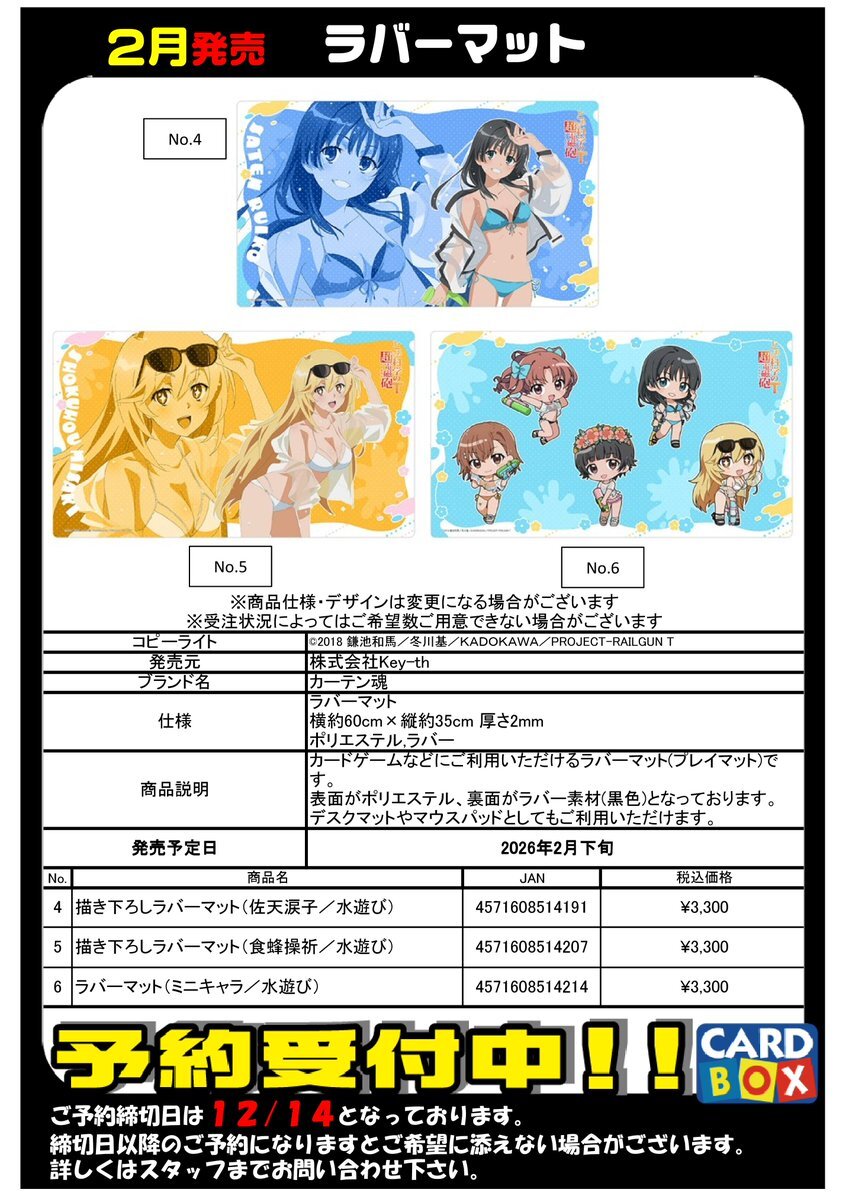 2月発売! 『とある科学の超電磁砲』 ・ラバーマット 全6種 ご予約受付中!! ご予約締め切り日は12/14となっております #カードボックスイオンモール姫路店 pic.x.com/Swz1yuEQmM