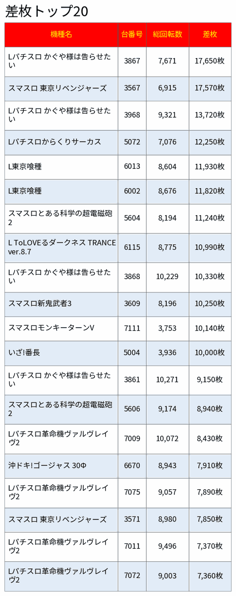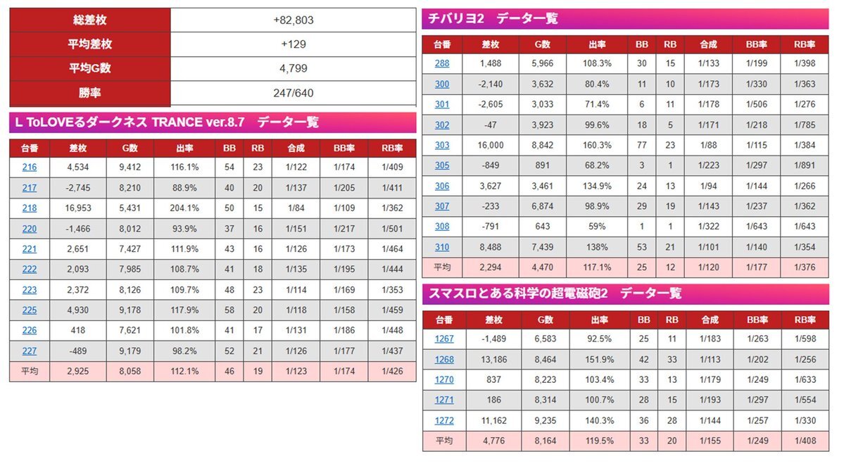 11/16 【123+N羽曳野店】 《ジャンバリ潜入来店取材》 🌈総差枚 +93,009枚 🌈台平均 +210枚 【とある科学の超電磁砲2】 🚩台数:3台 ✅合計差枚:+16,944枚 ☑平均差枚:+5,648枚 1027番:+13,056枚 1026番:+3,500枚 【東京リベンジャーズ】 🚩台数:14台 ✅合計差枚:+29,610枚