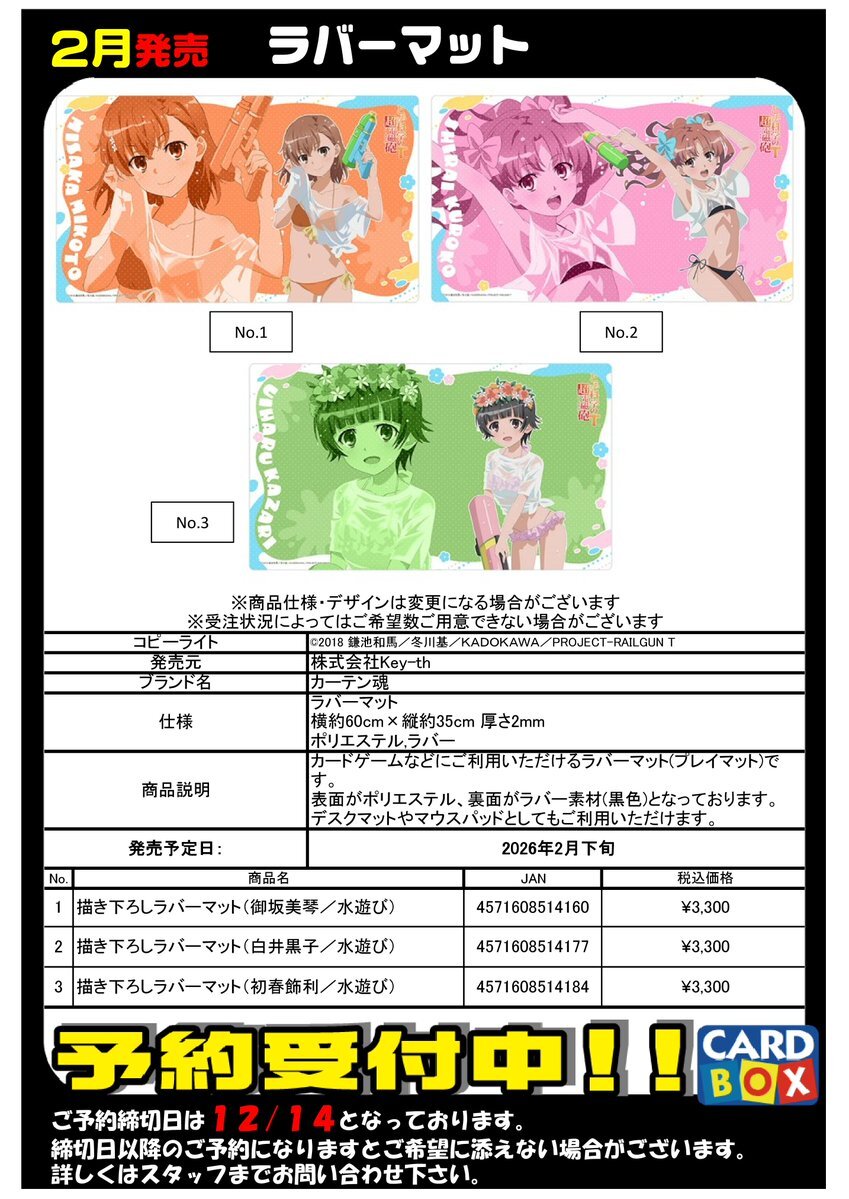 月発売! 『とある科学の超電磁砲』 ラバーマット ご予約受付中!! ご予約締め切り日は12/14となっております #カードボックス岡山駅前店 pic.x.com/ZWRAqWjIms