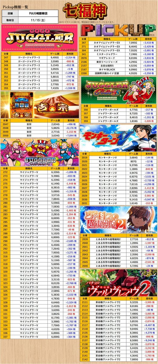 [取材レポート]11/15(土) #PR #スロミュー [神奈川] ・PIA川崎銀柳店 (スロミュー七福神🔥調査隊来店) ✅Pickup機種👇 ゴーゴージャグラー3 ジャグラーガールズ 吉宗 モンキーターンV とある科学の超電磁砲2 マイジャグラーV 革命機ヴァルヴレイヴ2 その他Pickup箇所 pic.x.com/WGHz8aCpsF x.com/SLOT_MUSIC456/…