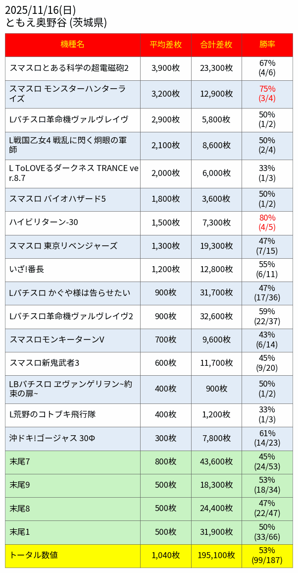 #スロット結果データ📈 ~茨城県~ 11月16日(日) 🔥ともえ奥野谷 ※6の付く日 👑機種TOP3 🥇とある科学の超電磁砲2 🥈モンハンライズ 🥉ヴァルヴレイヴ 📝総差枚+118,200枚 ✨平均差枚+220枚✨ 全台系.1/2&1/3機種.並び.単品 勝率:46.2%(244/528) pic.x.com/aOIoZjHToR
