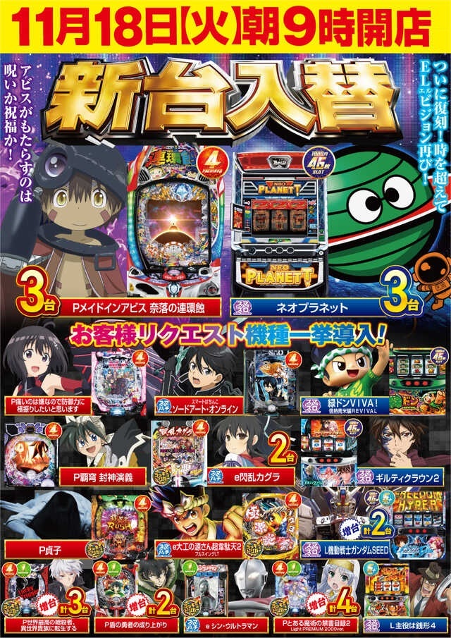 新┃台┃入┃替┃ ━┛━┛━┛━┛ ⚔11月18日(火)⚔ ⚔新台入替9時開店⚔ / ✨スロットコーナー✨ ✨春日井最大級6⃣6⃣0⃣台✨ だから出来る!? お客様リクエスト機種を!! ドーンと!!多機種”復刻”!! \ 《20円スロット》 🆕Lネオプラネット【3台】 🆕L緑ドン x.com/castle_kasugai…