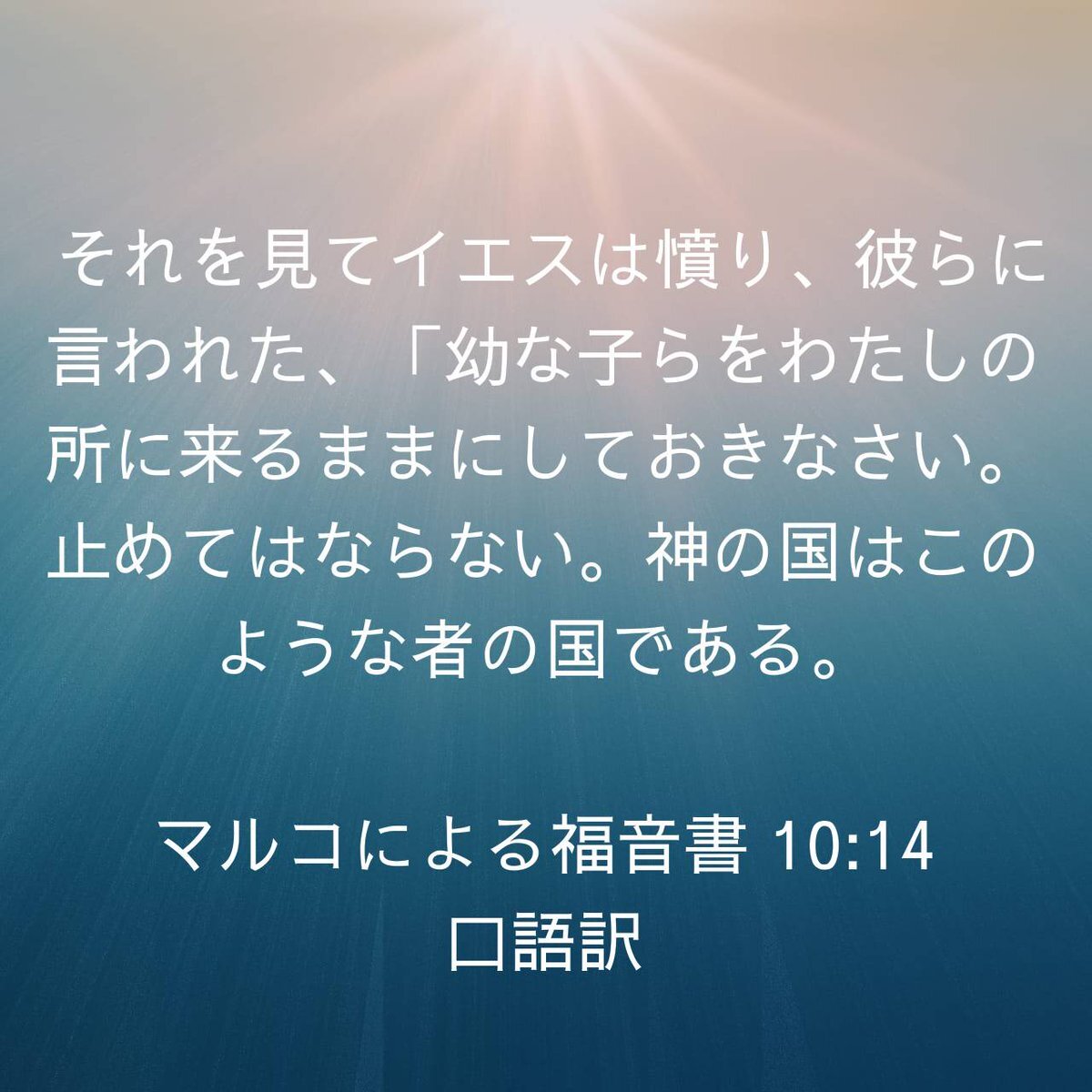 マルコによる福音書 10:14 口語訳 [14] それを見てイエスは憤り、彼らに言われた、「幼な子らをわたしの所に来るままにしておきなさい。止めてはならない。神の国はこのような者の国である。 bible.com/bible/1820/mrk…