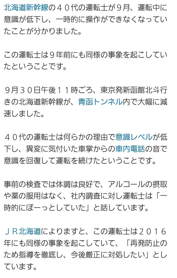 こっちの事案の方が余っ程問題だわw 新幹線運転中に意識低下「ぼーっとしていた」青函トンネルで大幅減速 9年前にも…JR北海道(STVニュース北海道) #Yahooニュース approach.yahoo.co.jp/r/QUyHCH?src=h…