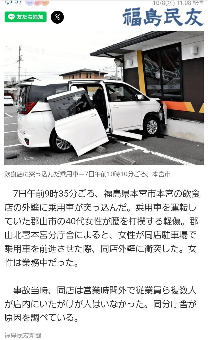 運転手さんは⚠️40代女性 踏み間違えでしょうか?! 「乗用車を前進させた際、外壁に衝突」 news.yahoo.co.jp/articles/1c008… #事故 #交通事故 #衝突事故 #操作ミス #アクセル #ブレーキ #福島 #飲食店 x.com/aoisora139peac…
