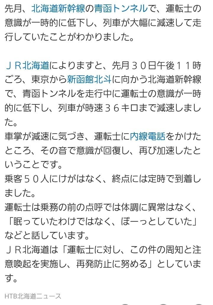 「眠っていたわけではなく、ぼーっとしていた」新幹線運転士の意識が一時的に低下 青函トンネルで大幅減速(HTB北海道ニュース) news.yahoo.co.jp/articles/59ee2…