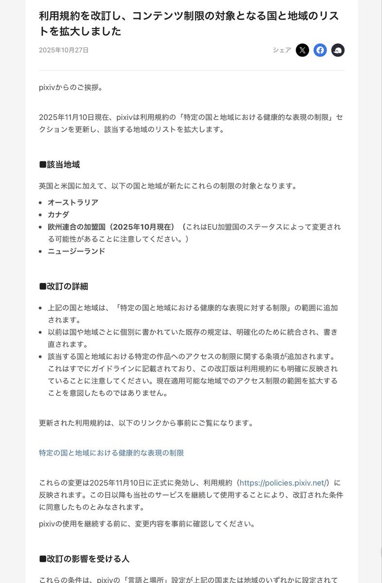 pixivが規約を改定し、コンテンツ制限の対象国を拡大。新たにオーストラリア、カナダ、EUで写真のような制限が適用されます。理由は明らかにされていませんが、いずれも規制圧力が強まっている国であり、内容はVISAやMastercardが定めるコンテンツ制限規約の文言に重なる部分も散見される。この発表を