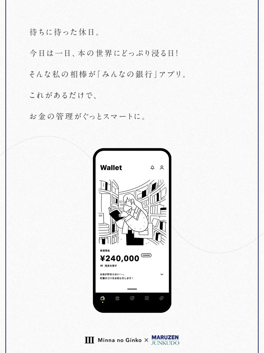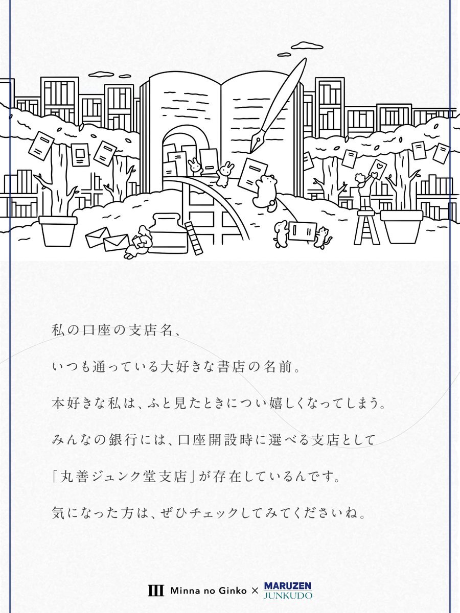【丸善ジュンク堂×みんなの銀行📚】 本好きのあなたにおすすめしたい、みんなの銀行「丸善ジュンク堂支店」 みんなの銀行らしい、支店のイラストにも本がたくさん。 読書の秋に、ずっと読みたいと思っていた本やお気に入りの一冊を手に取ってみるのはいかがでしょうか。 pic.x.com/RnRp3ypqct