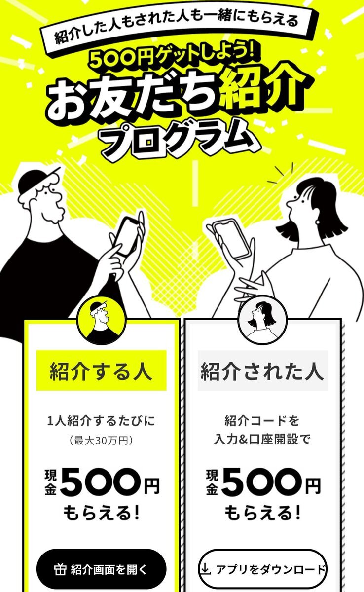 お得に口座開設! 口座開設時に紹介コード入力で500円プレゼント 公式サイト:minna-no-ginko.com/about-referral/ ダウンロード:minna-no-ginko.go.link/bbKKz 紹介コード:qSAWjbjk ※金額は現時点。適用条件はコード入力時の注意事項をご覧ください みんなの銀行お友だち紹介プログラム参加者によるご案内です