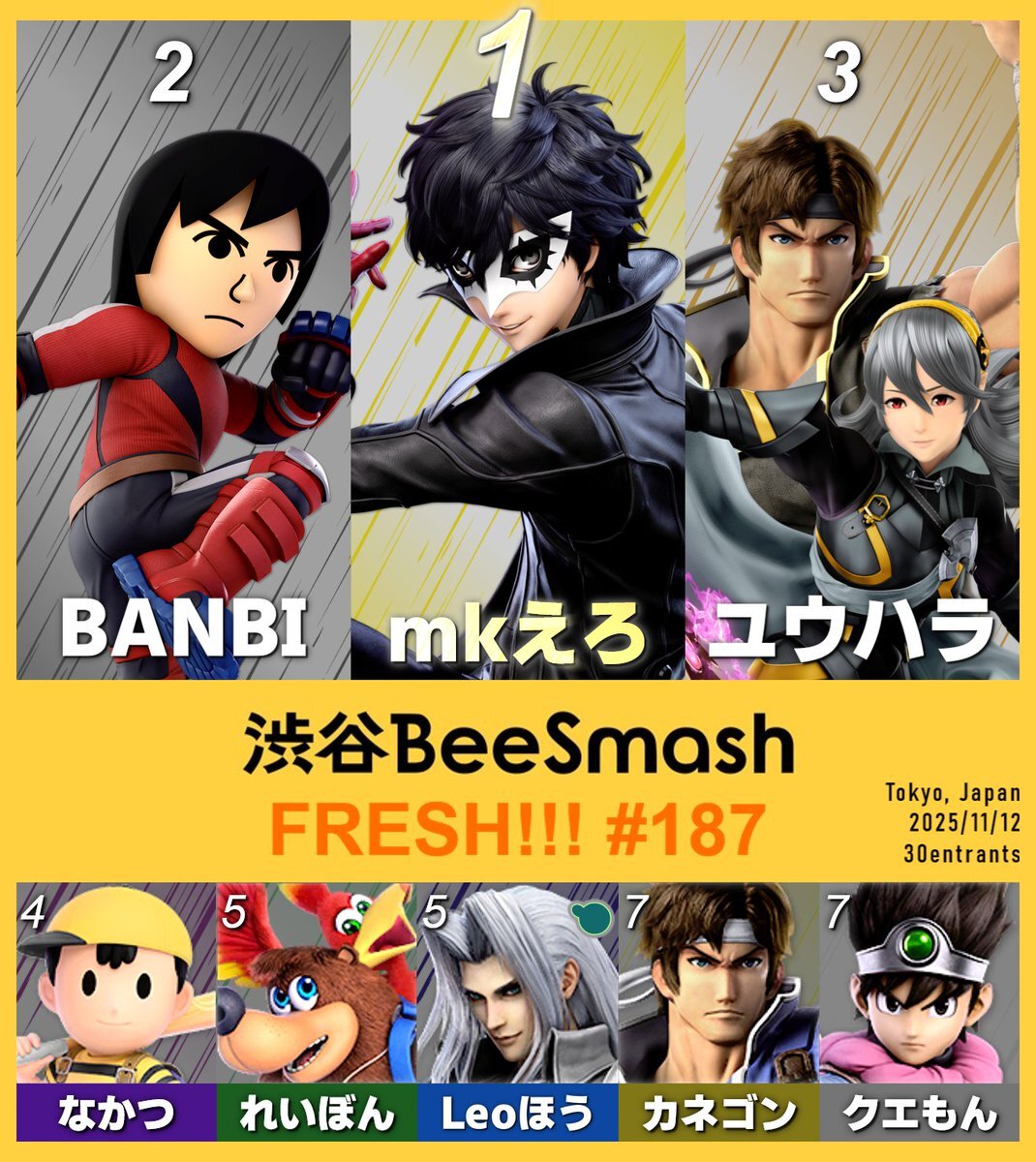 🏆#渋谷BeeSmash FRESH!!! #187🏆 🏅mkえろ(@chintokodokkoi) 🥈BANBI(@BANBI40070076) 🥉ユウハラ(@yuuhara_SSB) ★配信 youtube.com/live/Sam6BTDak… ★結果 smashfreaks.games/events/01K9VDY… ★決勝トーナメント braacket.com/tournament/7E3… ★予定 tonamel.com/organization/i…