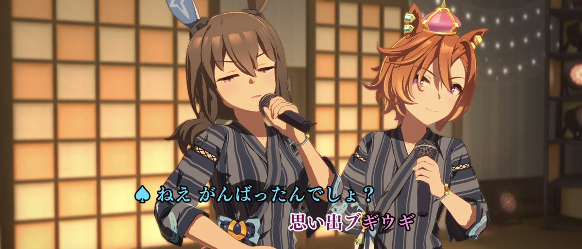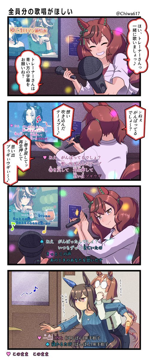 返信先:@allitellゆこまロマン純情派の歌唱ありウマ娘は、間奏約18秒で固有の語りがあり、トランならアイス持ってきたよん。一緒に食べよーぜぃ。歯磨きした?またすれば良いじゃん。など。 アヤベさんは、気を抜くのは今日まで。明日からトレーニングに集中。寝冷えしない様にちゃんと布団掛けて。 オカン?優しい… pic.x.com/Y9MK5iT69W