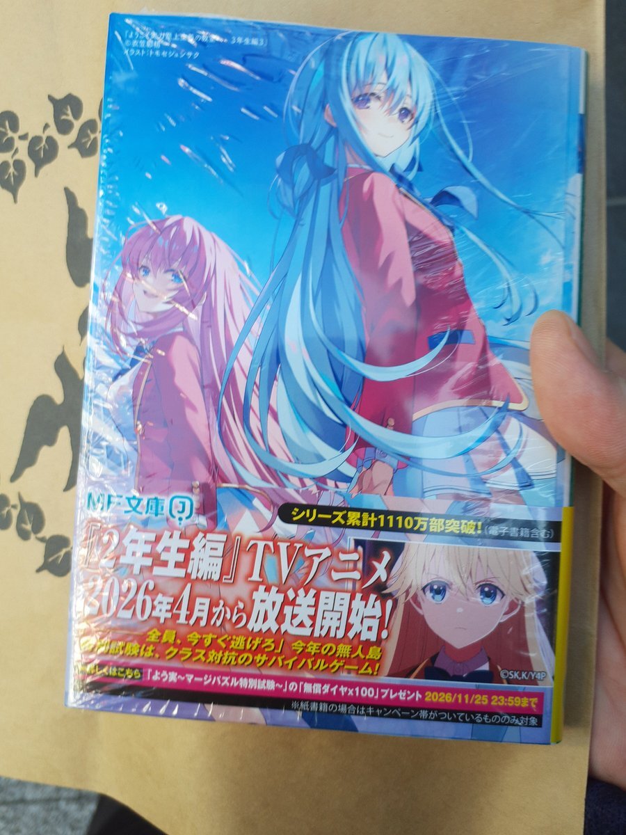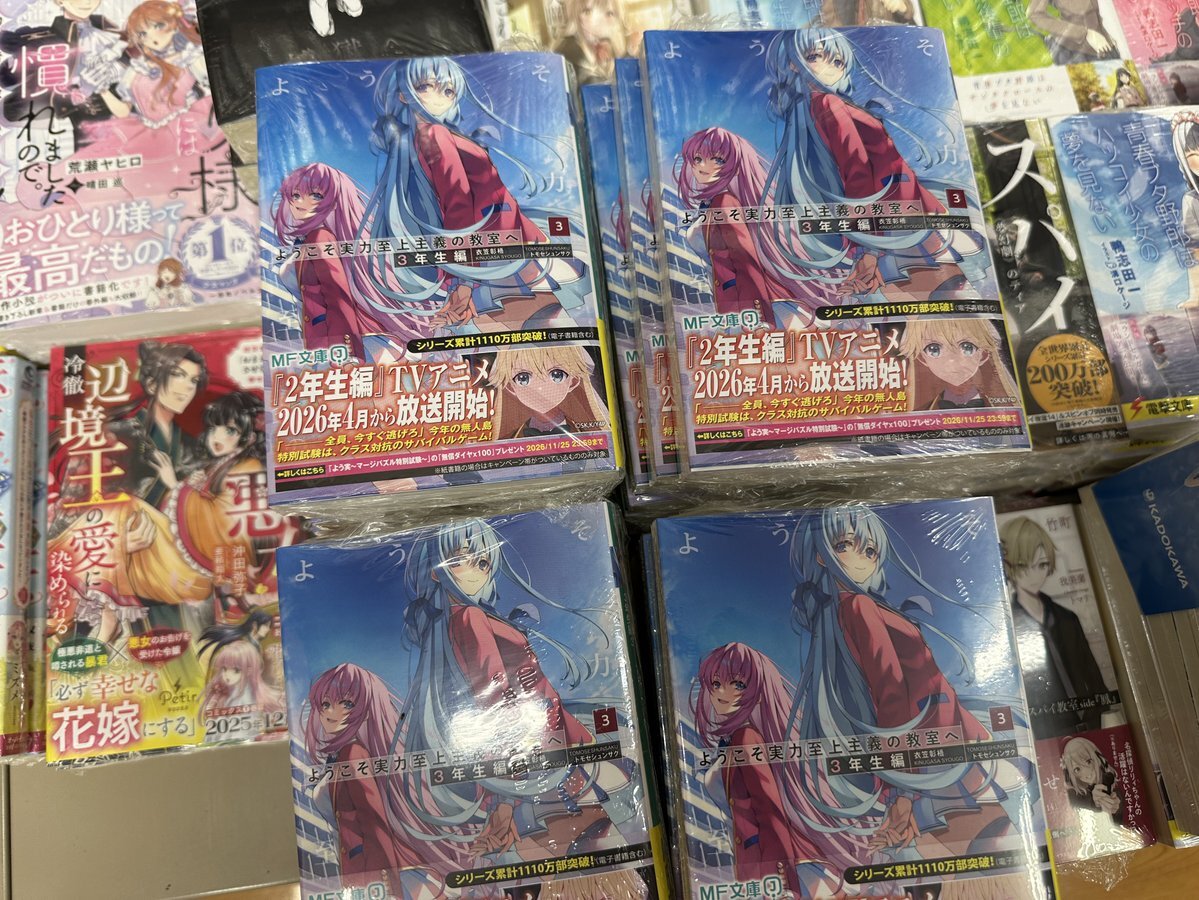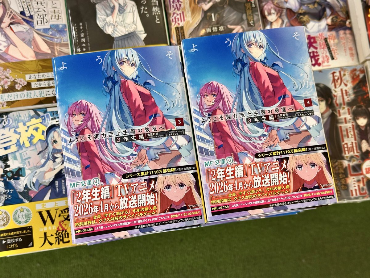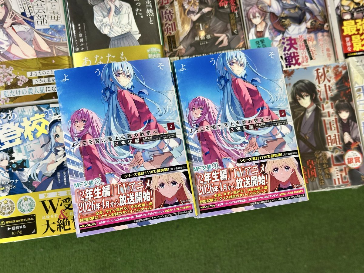 書店員ブログ更新:【今日の書店員注目新刊】本日、KADOKAWA・MF文庫Jさん・衣笠彰梧先生の「ようこそ実力至上主義の教室へ 3年生編 第3巻」発売!品出しをしている最中からわっさわっさと売れておりました! #ようこそ実力至上主義の教室へ #よう実 #衣笠彰梧 amzn.to/4osdhjj