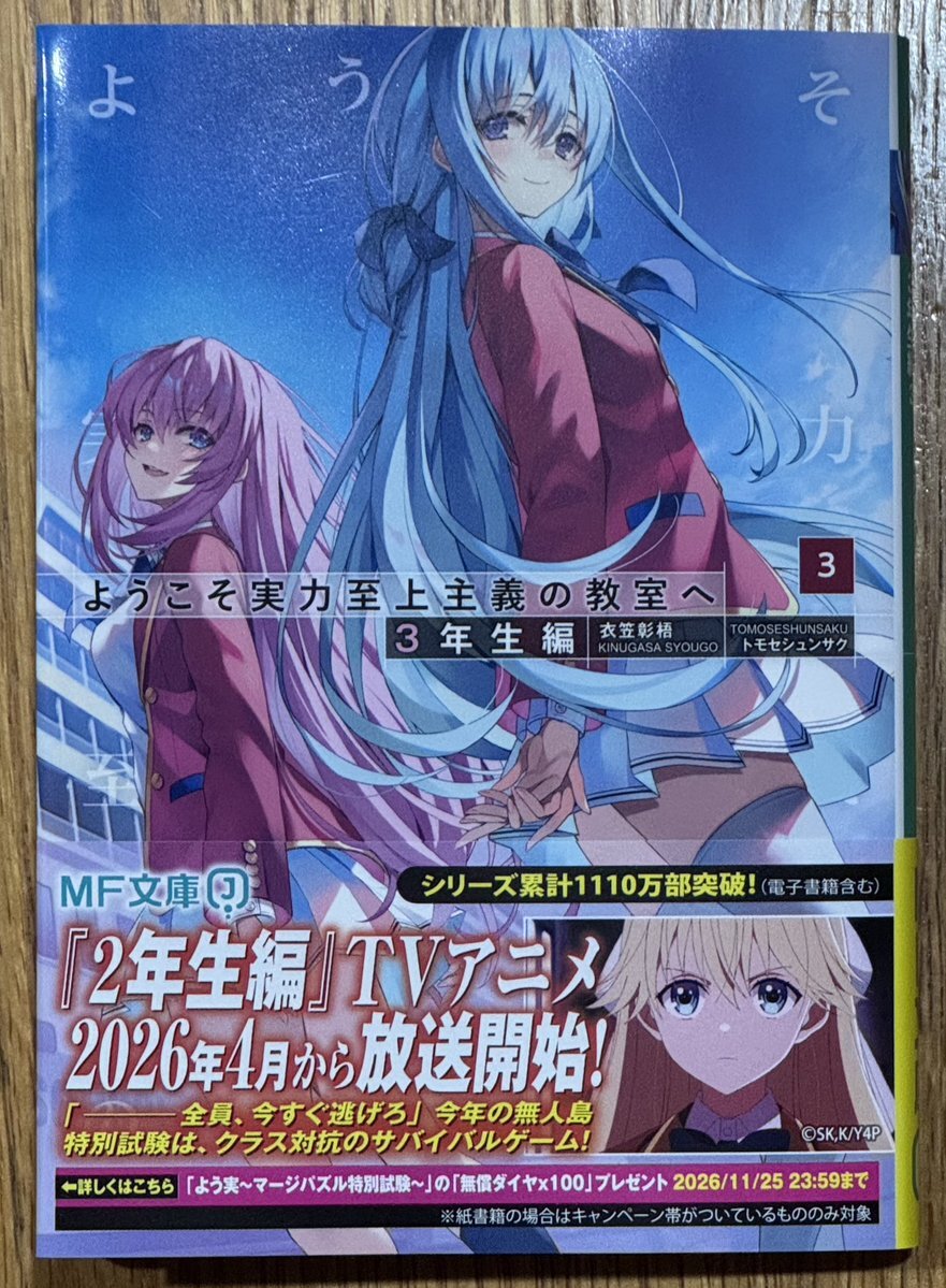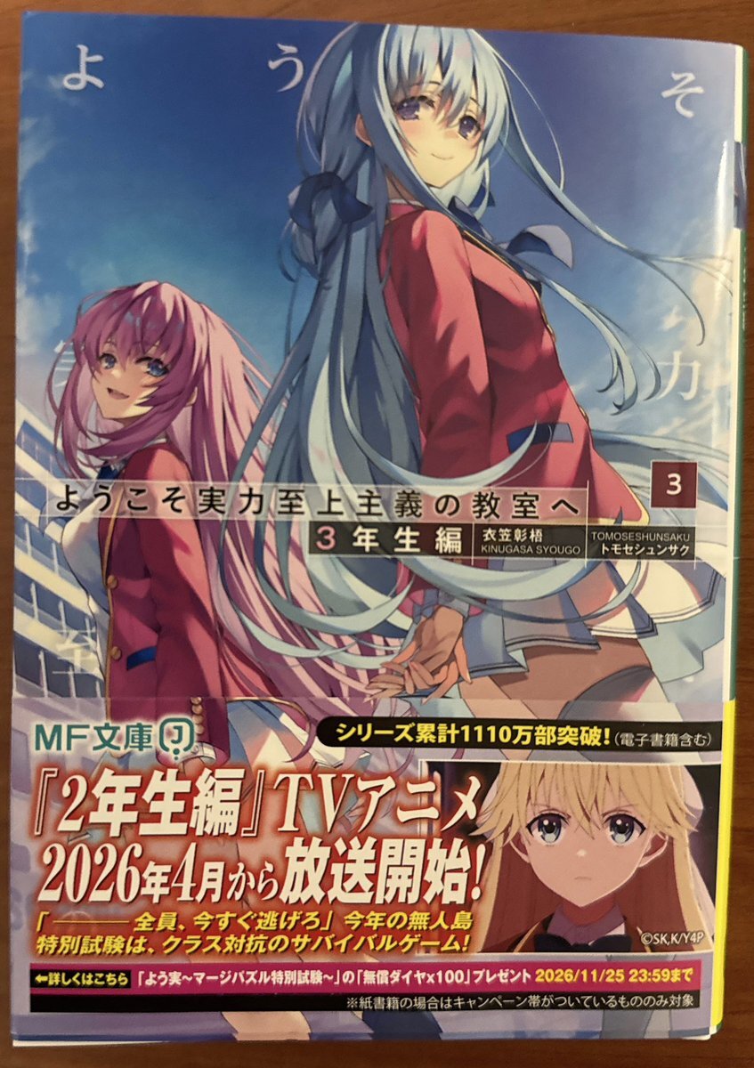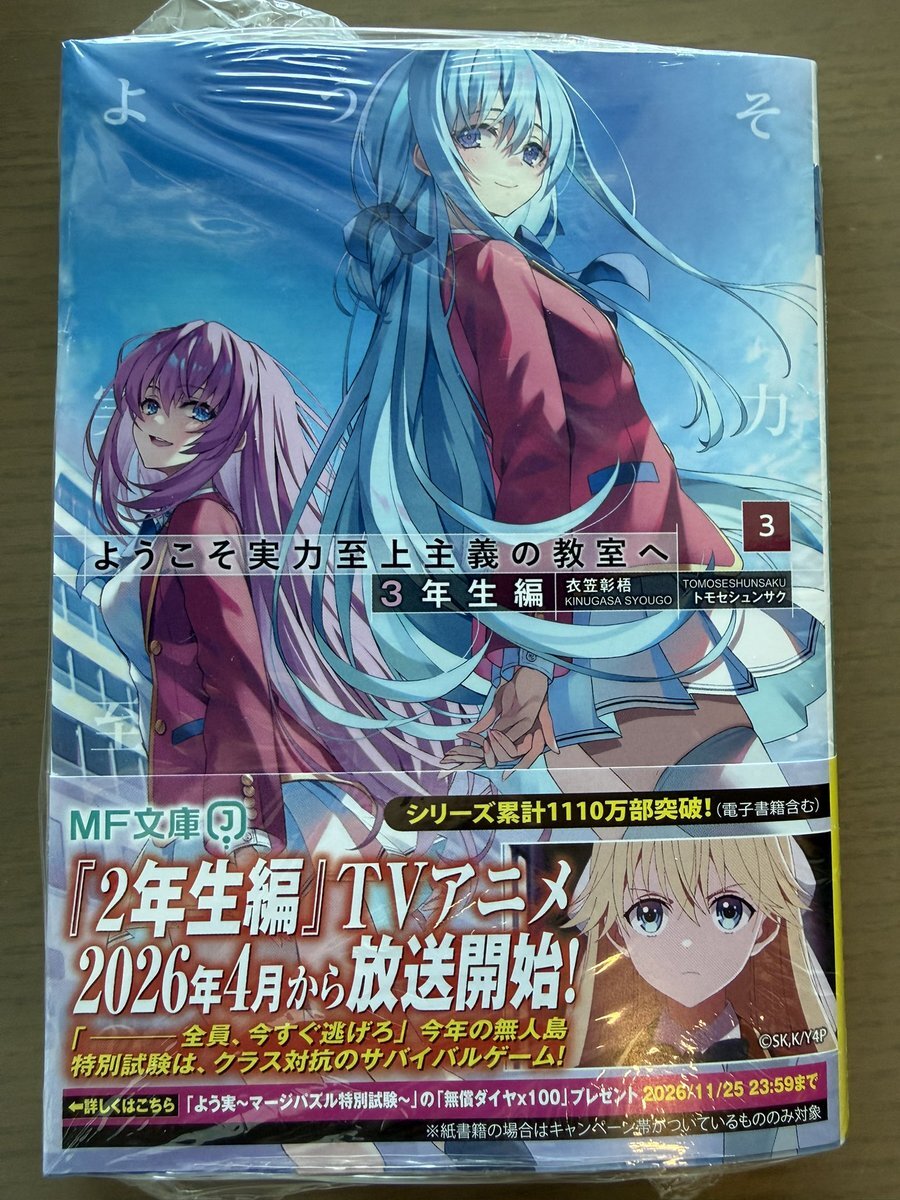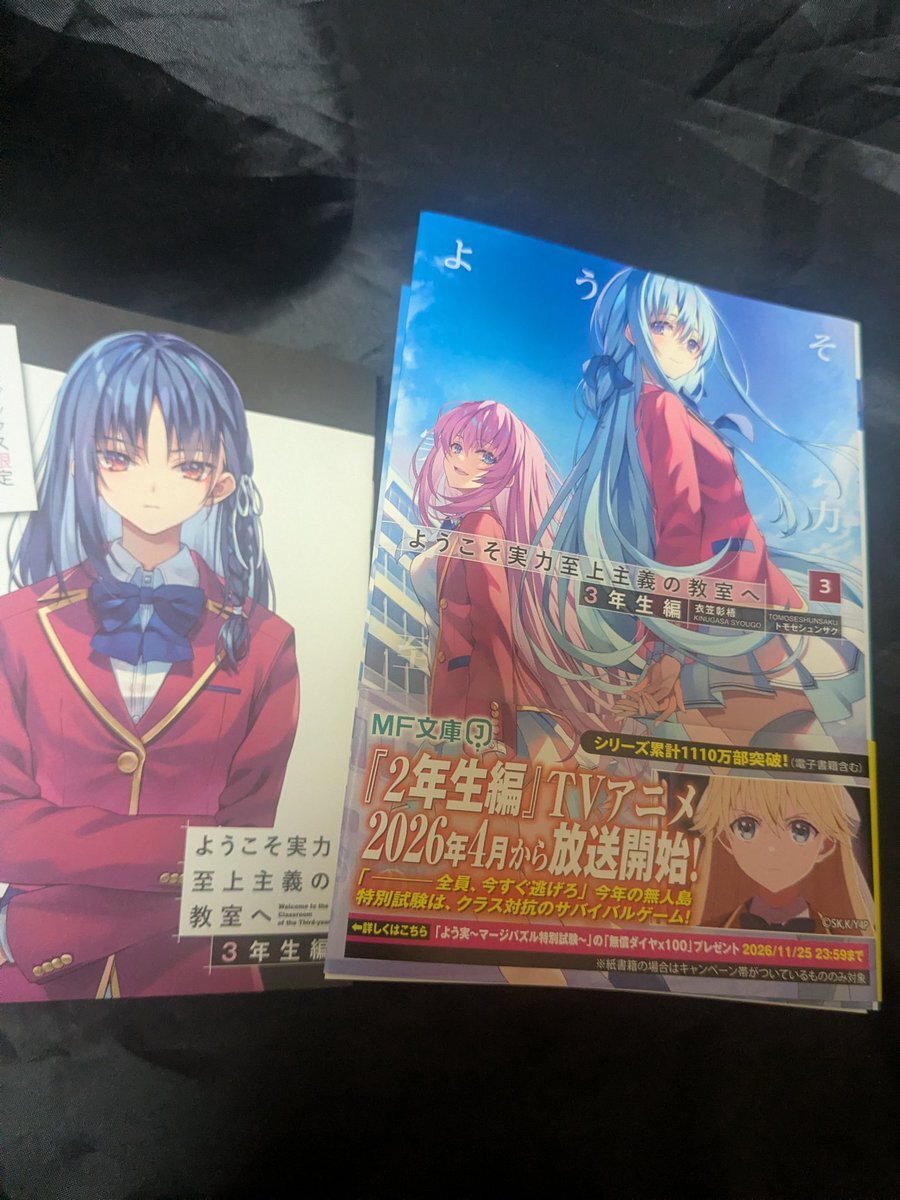 【注目新刊もポイント3倍】本日、KADOKAWA・MF文庫Jさん・衣笠彰梧先生の「ようこそ実力至上主義の教室へ 3年生編 第3巻」が発売!只今特典「ポストカード」をお付けしております!更に今日と明日、ポイント3倍です!(あ) #ようこそ実力至上主義の教室へ #よう実 #衣笠彰梧 pic.x.com/uK1HEx3Z8D