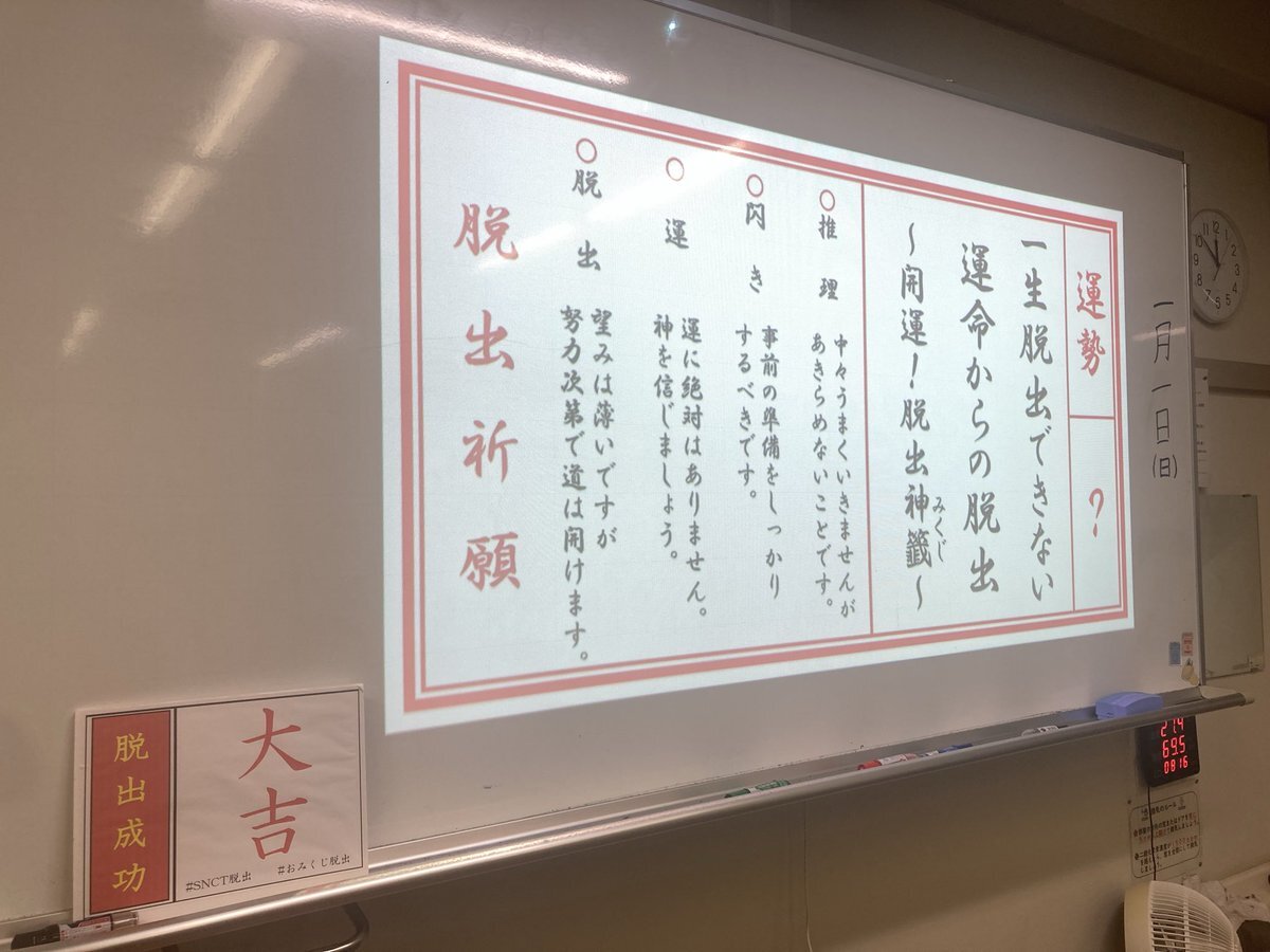 朝イチはこちらから。 何故かよく知ってる人たちがきて即席チームが出来上がりました。 これ面白すぎたな…明確に盛り上がりポイントがあって公演として楽しい! システムも良くて一生謎解いてたくなる… #おみくじ脱出 #SNTC脱出 pic.x.com/LOwO0dWBH0