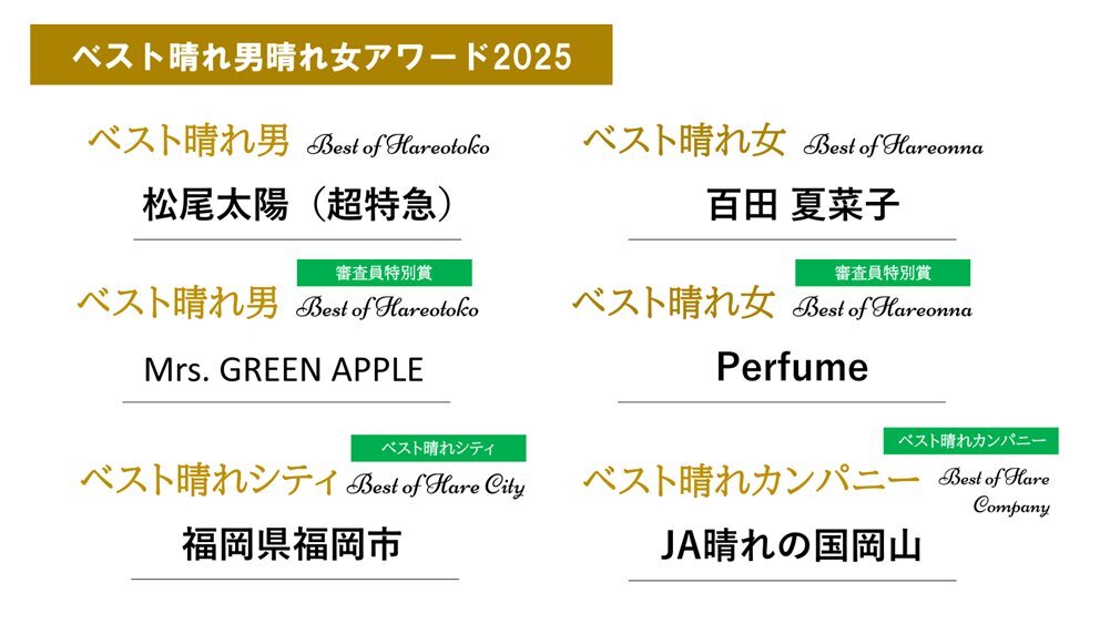 ベスト晴れ男晴れ女アワード2025が開催されました。 授賞者の方々をご紹介します。 ベスト晴れ男2025 松尾 太陽 さん(殿堂入り) ベスト晴れ女2025 百田 夏菜子 さん(殿堂入り) 審査員特別賞 Perfume さん Mrs. GREEN APPLE さん ベスト晴れカンパニー2025 JA晴れの国岡山 様