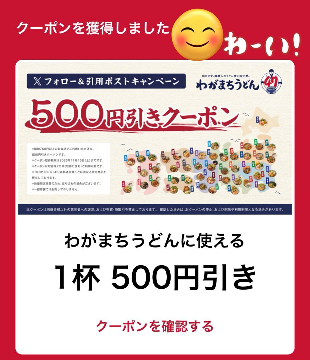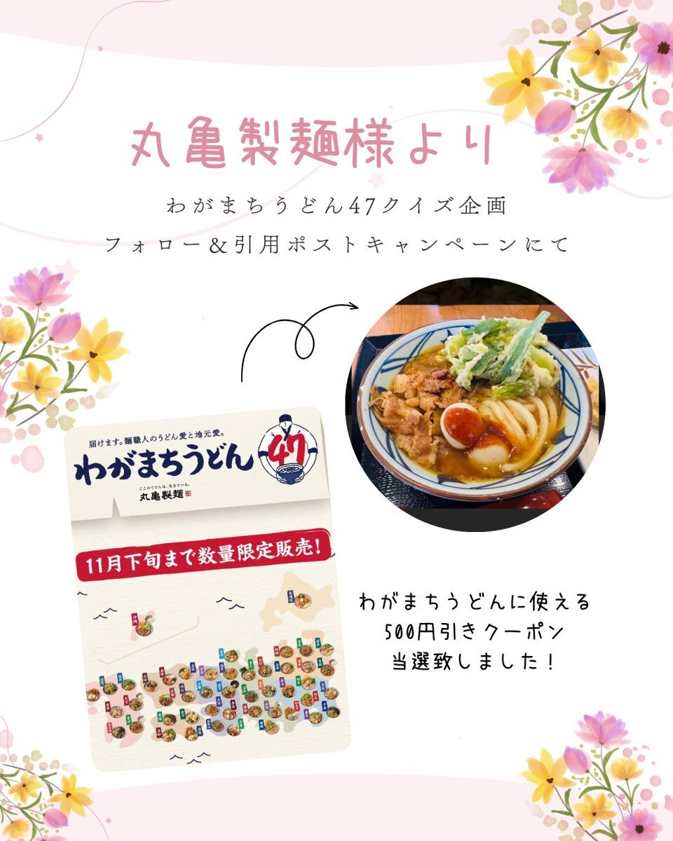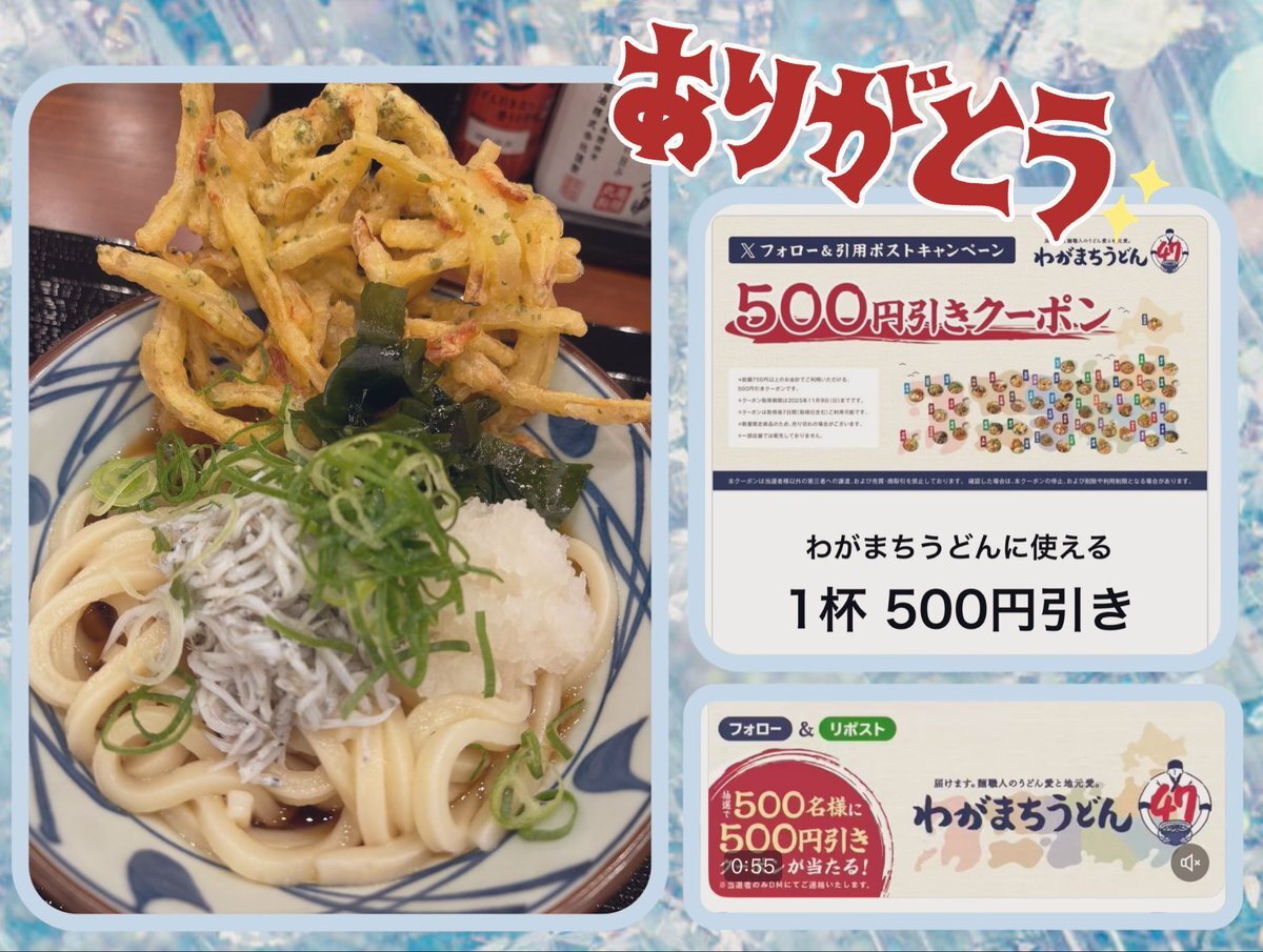 丸亀製麺 @UdonMarugame 様の わがまちうどんCPに当選して 500円引きクーポンを頂きました❣️ 美味しいおうどん食べに行きたいと思います😋 この度は素敵なご縁をありがとうございました✨ #ルナの幸せ当選報告 pic.x.com/YQRe7iX8cv