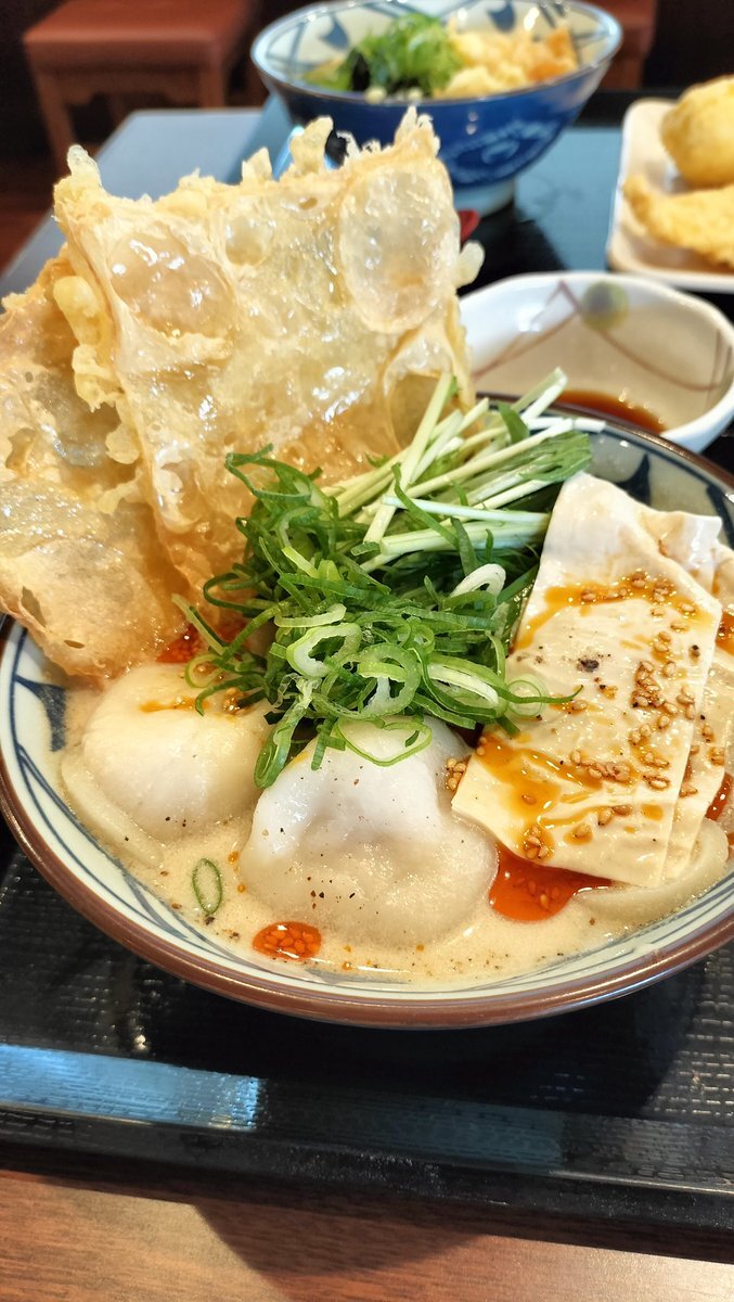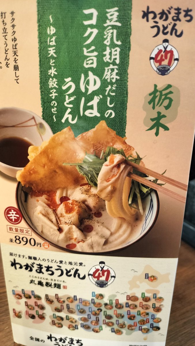 今日のランチは丸亀製麺のわがまちうどん 湯葉と水餃子は栃木県らしいね ピリ辛の豆乳胡麻だし、中々美味しかったです 他の県のも気になったけど、写真が小さすぎてどんなのかさっぱり分からず😅 フォロワーさんで食べた方、どんなのか見せてくださいな #丸亀製麺わがまちうどん pic.x.com/if4sEWEDa7