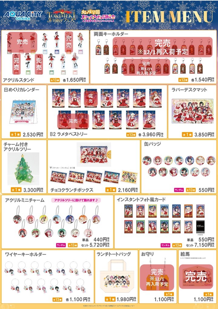 🔔「アクアシティお台場×ラブライブ!虹ヶ咲学園スクールアイドル同好会 TOKIMEKI Winterフェス」🎄 11/23(日)現在の完売商品はこちらです。 税込3,000円毎にオリジナルグッズが当たる抽選会にご参加いただけます✨ イベント詳細はこちら🎅✨⇒the-chara.com/blog/?p=101248 pic.x.com/nrxGOLBCqV