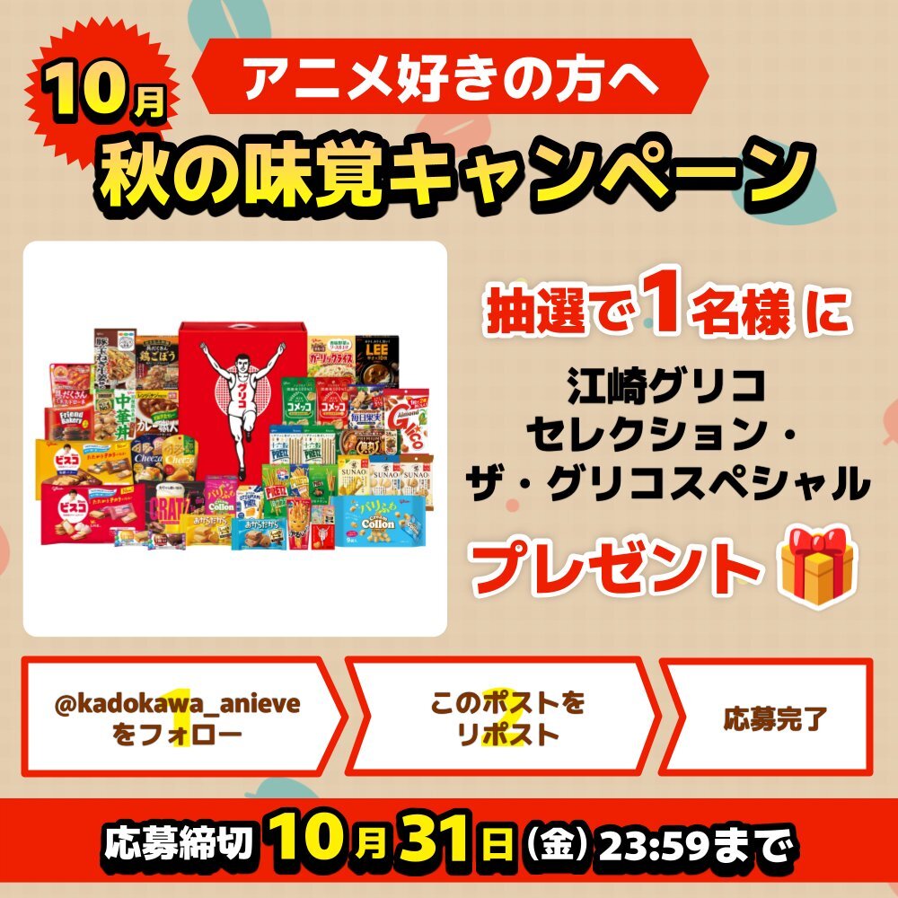 ˗ˏˋアニメ鑑賞のおともに!ˎˊ˗ 🍁秋の味覚キャンペーン😋 江崎グリコ セレクション・ザ・グリコスペシャル が抽選で【1名様】に当たる✨ 🎯応募方法 1️⃣@kadokawa_anieve をフォロー 2️⃣この投稿をリポスト(RP) 📆締切:10/31(金) 23:59まで ✅【おすすめアニメ】 をリプライして当選確率アップ🍂
