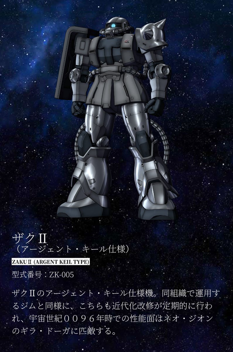 ZK-005 ザクⅡ アージェント・キール仕様 ◇アージェント・キールが運用する量産型MS。所属機は銀色の塗装に統一され、改修段階に応じた独自の型式番号が振られている。主要なコンポーネントを最新規格に更新する定期的な大規模改修により、U.C.0096の時点でギラ・ドーガに匹敵する性能を有している。 pic.x.com/dxFLzmMwoE