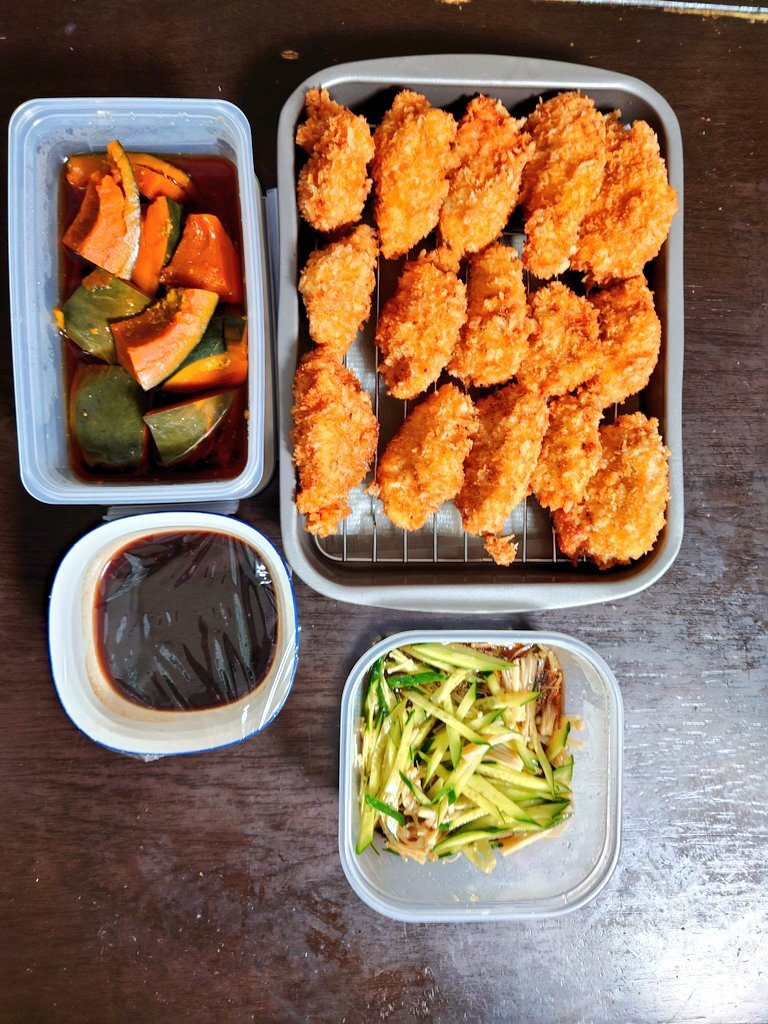 今日はチキンカツ(左下のタレカツのタレでどうぞ)、かぼちゃの煮付け、しめじとキュウリのポン酢あえ(材料あったし、昨日食べて美味かったからリピ) 耳鼻科行くため、ババ様来るまでに夕飯作って洗濯畳んで片付けて間に合わせたよ😅 出発する時に、能天気なババ様にちょっとイラッとした pic.x.com/GQpWdlbKsu