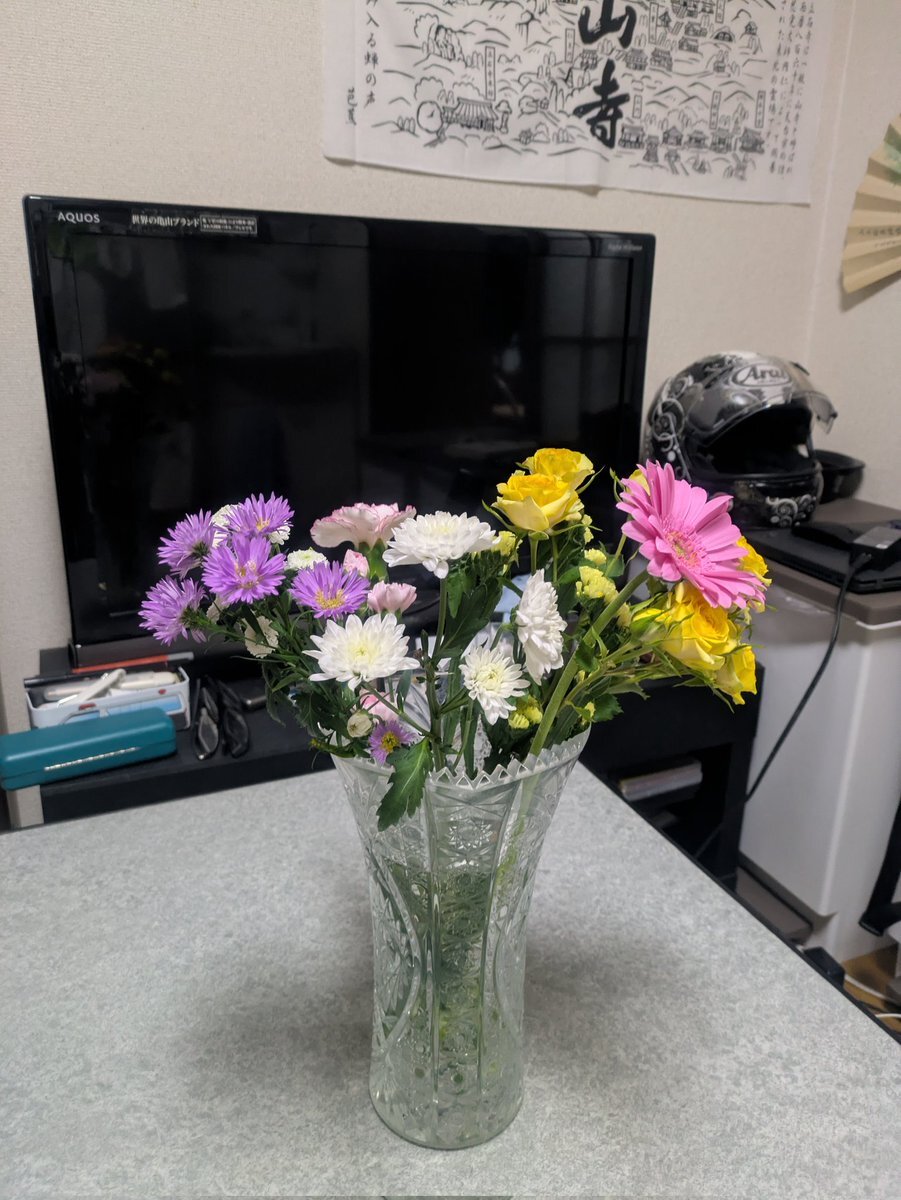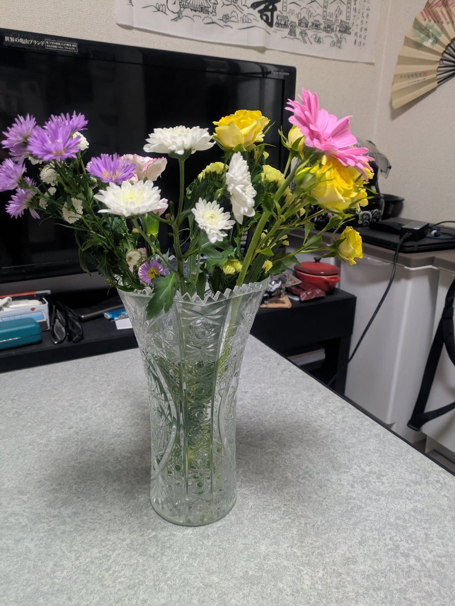 昨日、茶道の先生より ボヘミアグラスの花瓶を頂いたので 今日は早速お花を飾ってみました 花瓶が大きいので花も二束購入と 贅沢をしてみました すると脳内で エレカシの悲しみの果てにが流れ出す 部屋は⋯大して飾ってないが 珈琲はインスタントを浴びる程飲んで 花は飾ったぜ いつもの部屋に pic.x.com/4CEaXWk9zC