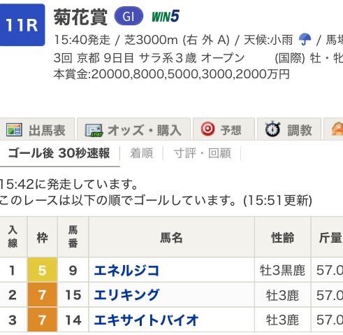菊花賞のウマ娘サイン馬券 キングエリザ → エリキング 三頭の竜 → 頭文字エの馬で123決着 はい。オカダステークスに続き炸裂ですね。 特に3着エキサイトバイオ関連はヤバい配当。 1着エネルジコはクラシック音楽用語で「力強く」の意なので金星獣エリChanの背後にいた音楽魔がサインでしたね!! pic.x.com/V8E1hbE29e