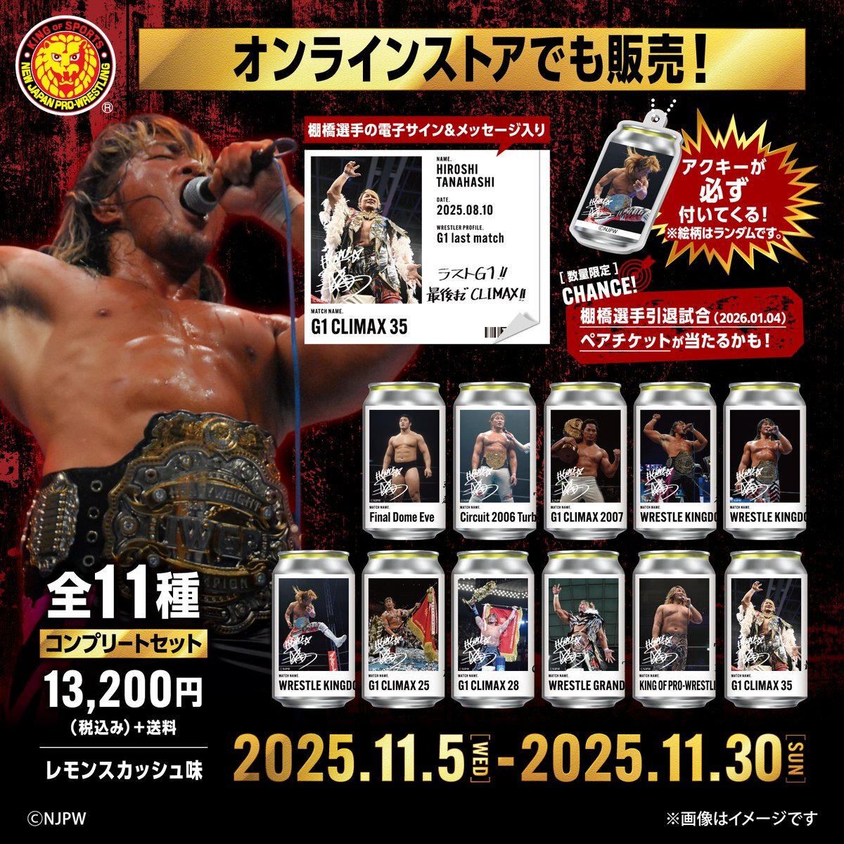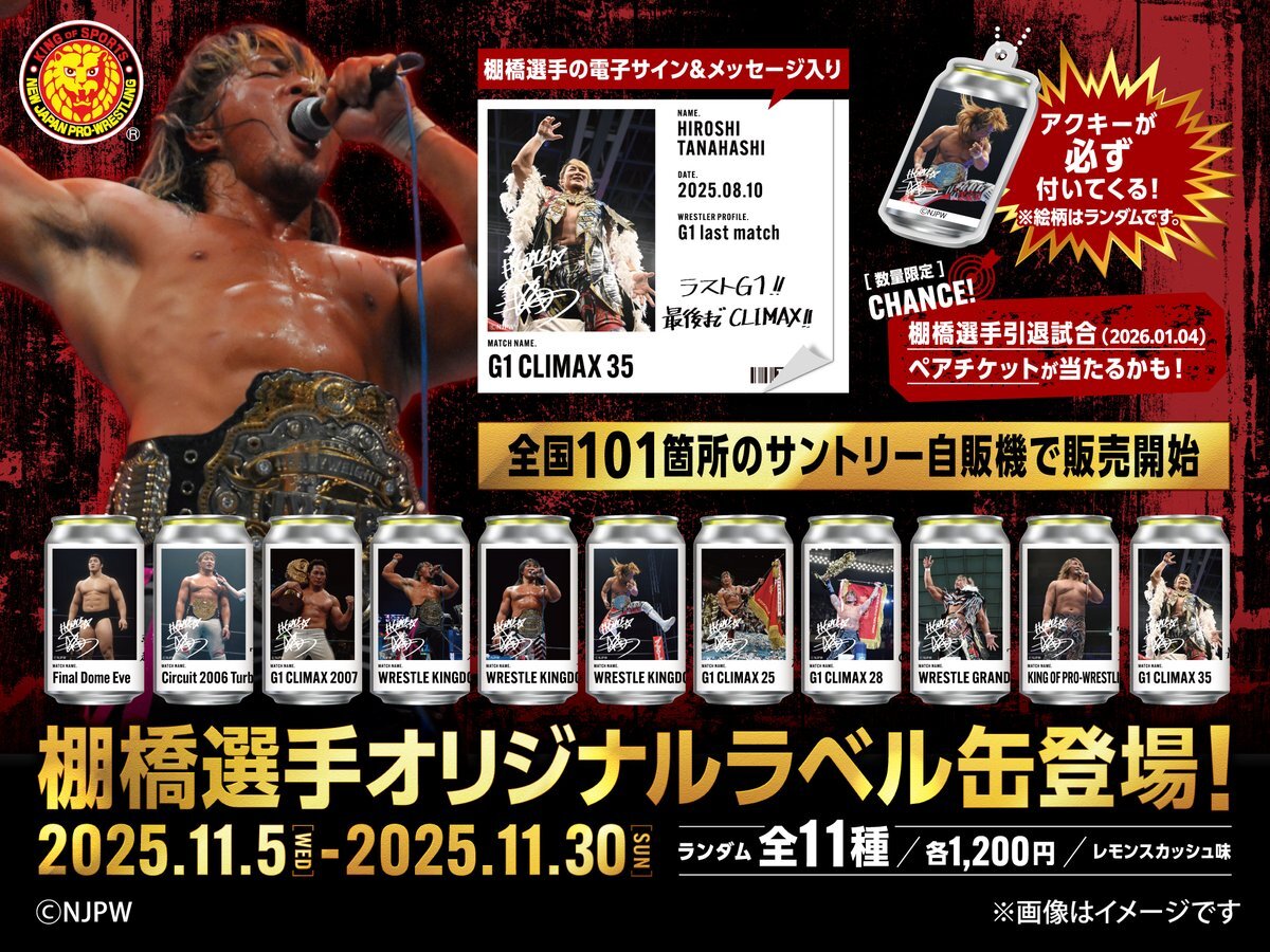 【11月30日(日)まで】 棚橋弘至選手のオリジナルラベル缶が好評発売中! 伝説の名場面デザイン全11種をお見逃しなく! 📍自販機MAP x.gd/c5LTu ️ オンラインストアはコチラ▼ beverageandfood.direct.suntory.co.jp/pages/tag-tana… #njpw pic.x.com/6lyXvV2JjQ
