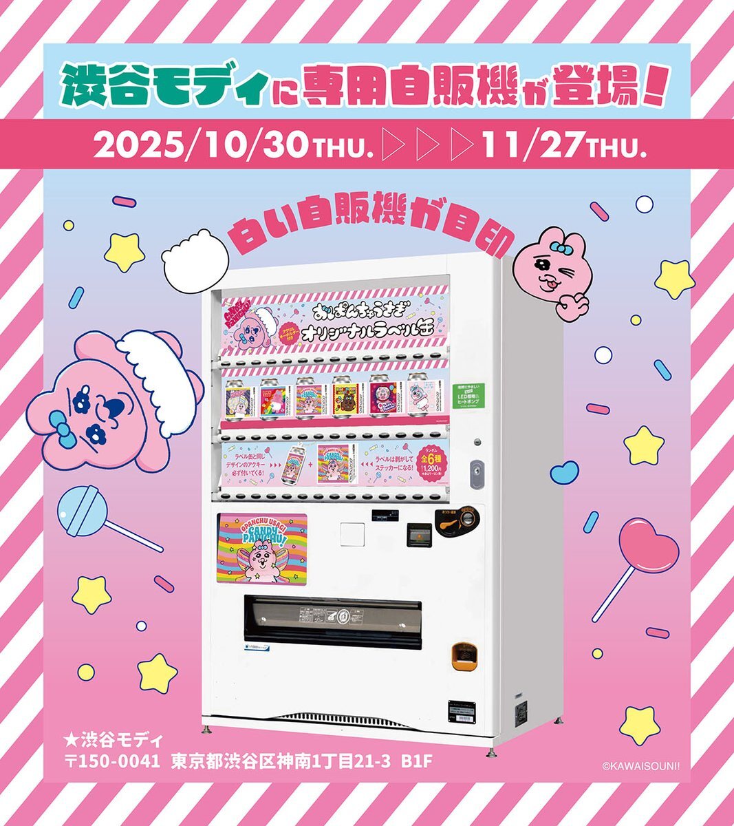 / #おぱんちゅうさぎとのコラボ企画✨ 全国約350箇所のサントリー自販機で オリジナルラベル缶販売中!! \ 🍭アクキー付きのラベル缶はPOP UP SHOP「CANDY PANICHU!」限定デザイン🍭 さらに渋谷モディに特別ラッピング自販機も登場中🎉 ぜひチェックしてください👀 📅 〜11/25(火)まで
