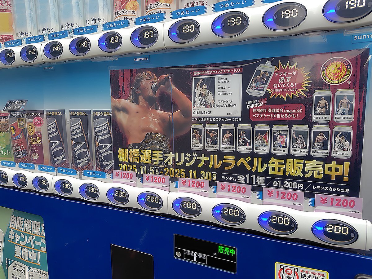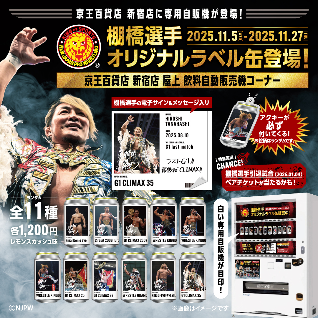 【専用ラッピングで展開中】 棚橋選手のオリジナルラベル缶が発売中! 伝説の名場面デザイン(全11種)✨ 📅販売期間 11月5日(水)~11月27日(木) 📍 設置場所 京王百貨店 新宿店 屋上 飲料自動販売機コーナー #njpw pic.x.com/bf8tfTqHhs