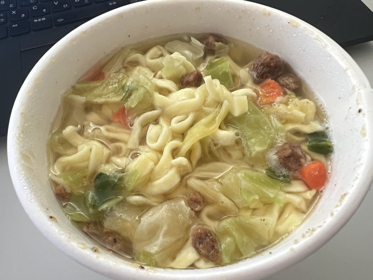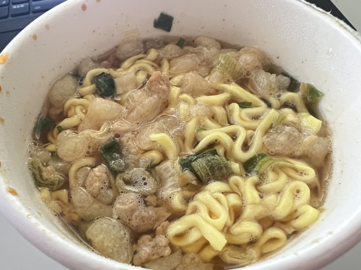 実食いたしました*´꒳`ฅ カップスターなので具はネギと謎肉っぽいツミレの小さいのと小さなメンマだけでちょっと寂しい感じですが、スープはガツンと生姜が効いていて美味しかった。麺は普通のツルツルした感じのちぢれ麺。寒い日におすすめ! x.com/cocoanyaa/stat…