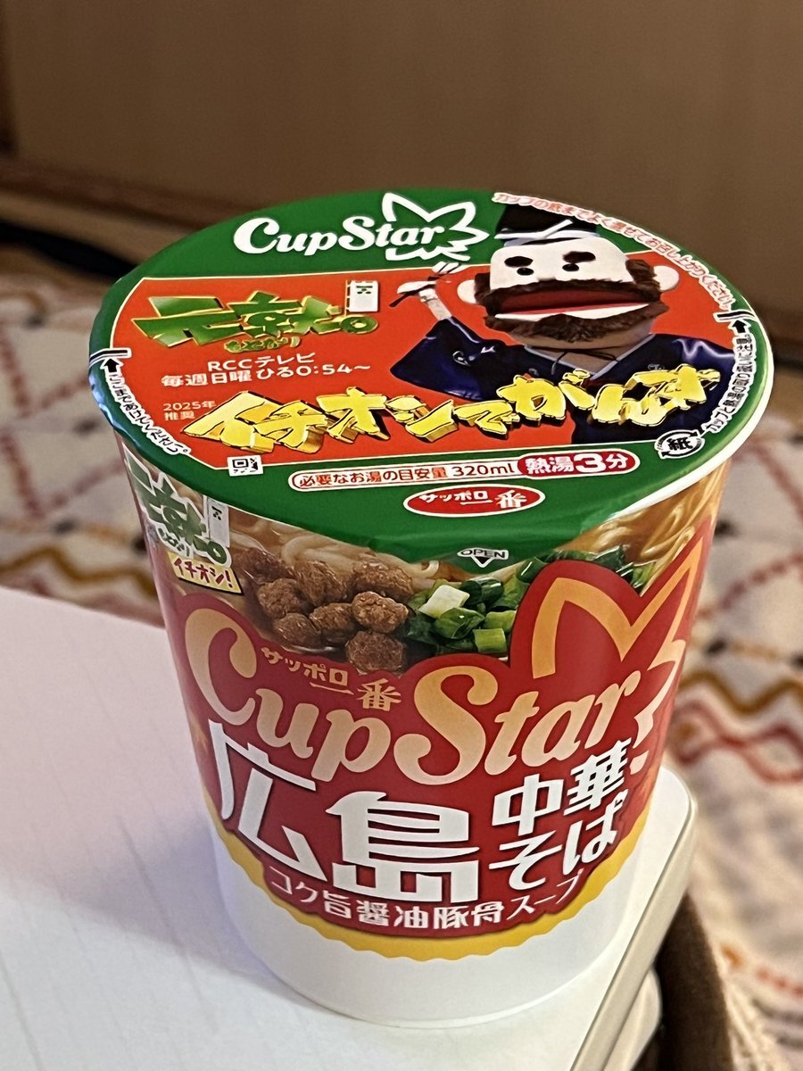 カップスターの広島中華そばです。前回も売っていたから第二弾かな。全国発売らしいので広島の宣伝になって良き!元就の番組バージョンになってます。RC Cテレビ毎週日曜ひる0:54〜と書いてあるけど、他の地区の人は見れないと思うけどねぇ😄 pic.x.com/jumiXTdYPv