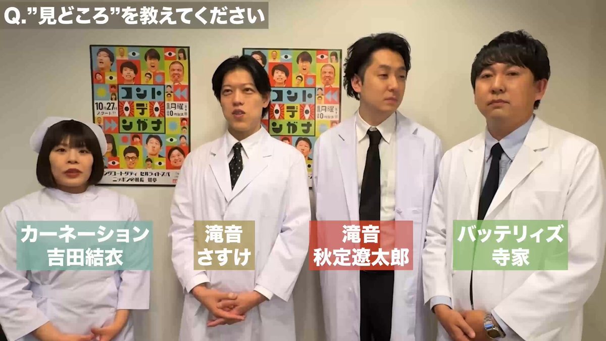 11月10日(月)深夜0時~ 『コント・デ・ンガナ』出演 4名のゲスト芸人からコメントが届きました! #吉田結衣 (#カーネーション) #さすけ #秋定遼太郎(#滝音) #寺家(#バッテリィズ) 似合いすぎている衣装を着て 4人はどんなコントに挑戦するのか…お楽しみに🏥 📺TVerで見逃し配信
