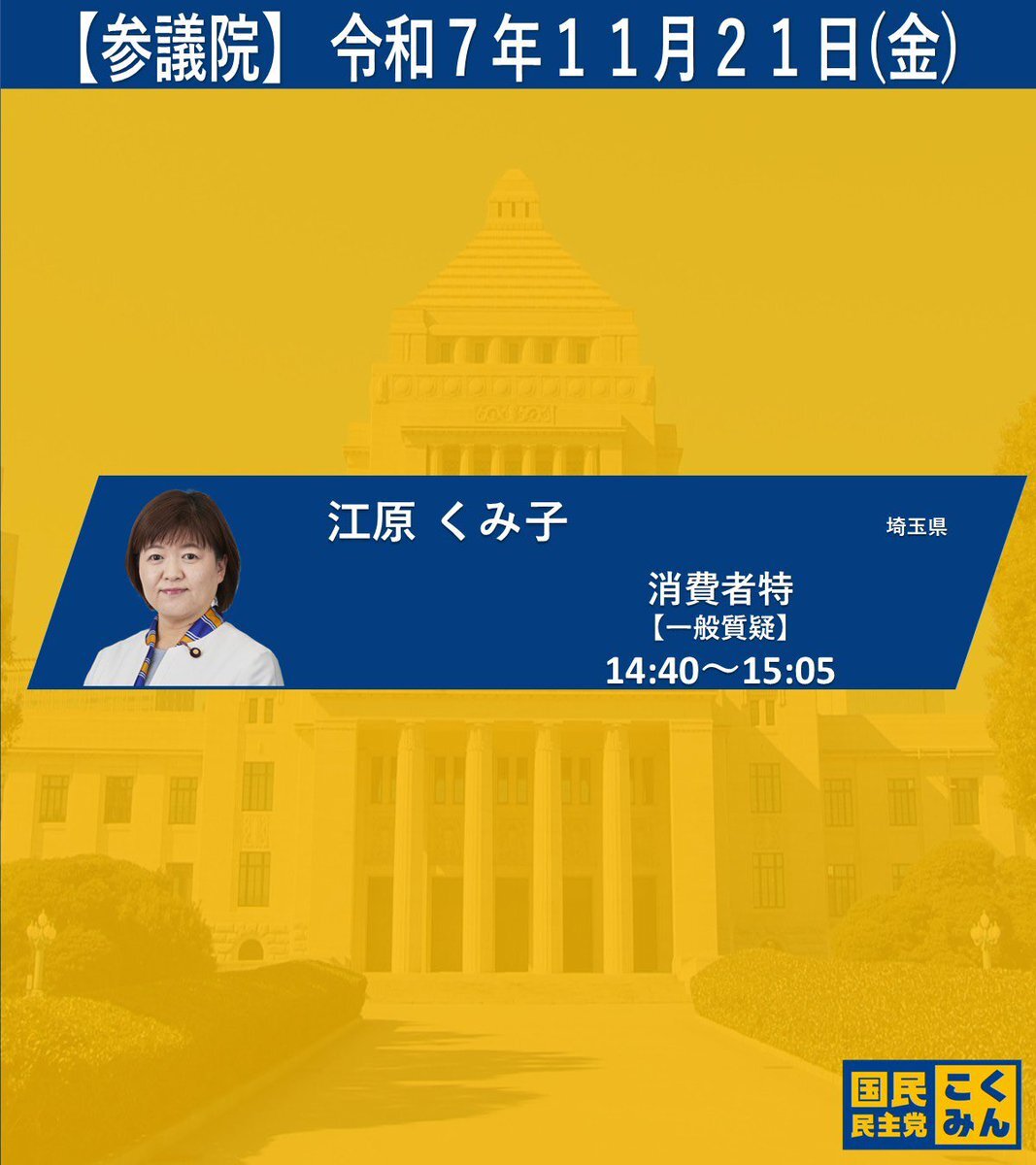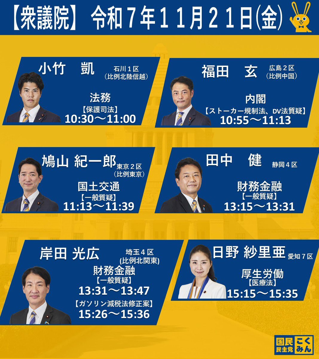 【衆参議院・明日の質疑予定】 11月21日(金)の質疑予定です。 インターネット中継のライブ配信、アーカイブ等でご覧ください。 なお、田中健衆議院議員はガソリン暫定税率廃止法案の提出者として15時以降答弁席に座ります。ぜひご注目ください。 #国民民主党 #国民民主党にワクワク pic.x.com/aUnhpj6oBz