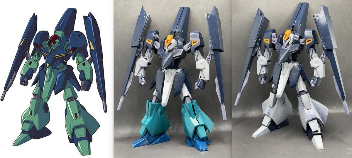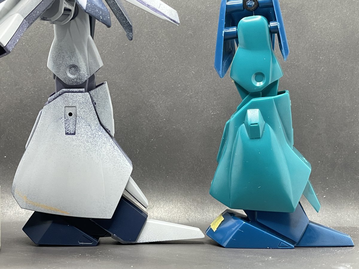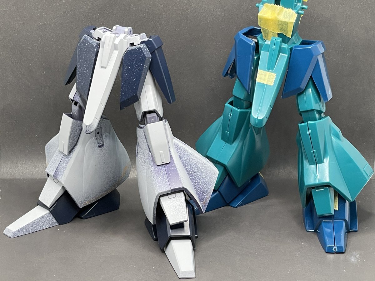 HG #ギャプラン 進捗。旧キットを組んで比較。やはり下半身のバランスについて、旧設定画には旧キットがかなり正解値を出していましたね。ヒザ下を入れ替えてみるといい感じだが、これで関節作り直すか、HGキットのまま裾上げすればある程度寄せられる可能性も高い、悩みどころ。 pic.x.com/vTSOJ4z5Xf
