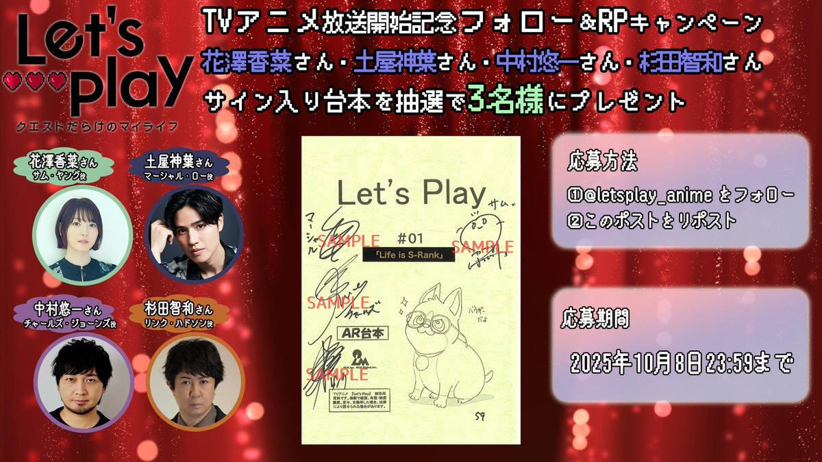 🎮... 放送開始記念 フォロー&リポスト #プレゼントキャンペーン ...❤ #花澤香菜 さん(@hanazawa_staff) #土屋神葉 さん(@simba_tsuchiya) #中村悠一 さん(@nakamuraFF11) #杉田智和 さん(@sugitaLOV) 直筆サイン入り第1話台本を抽選で