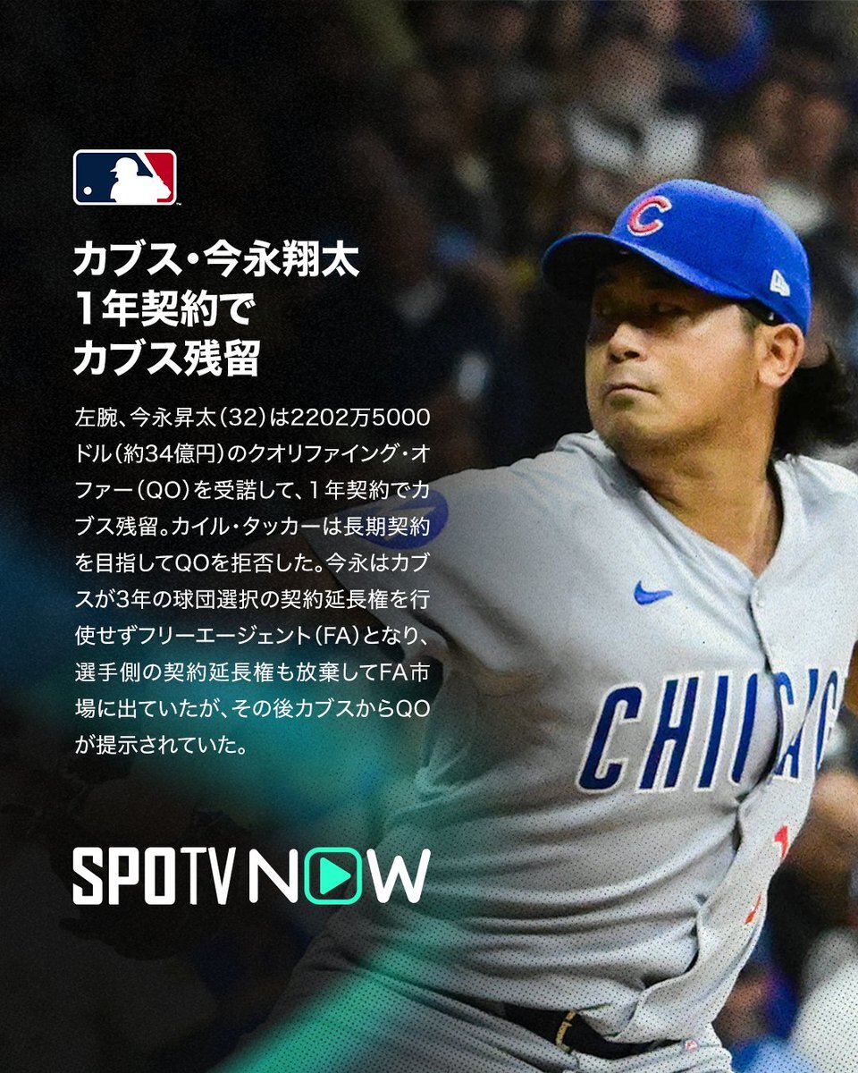 ✍️ MLB速報 🌟 今永昇太(32歳) シカゴ・カブス(再契約)🇯🇵 カブス残留決定!🔵 1年約34億円のクオリファイングオファーを受諾🤝 #MLBxSPOTV 2026年もMLB観るなら #SPOTVNOW!⚾️ pic.x.com/LRJHBOGMxI