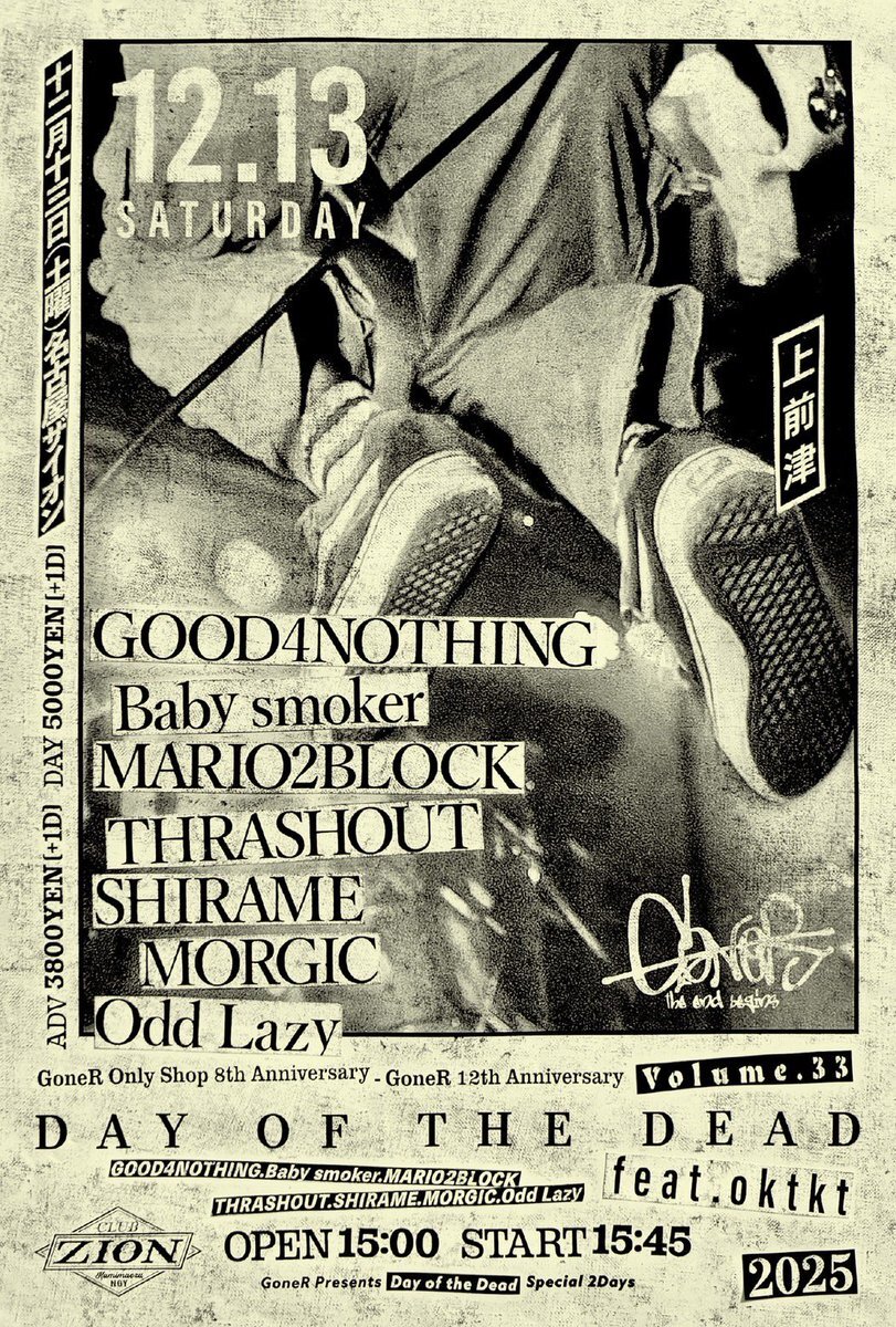 🔥1ヶ月後🔥 12月13日(sat) "GoneR Presents" Day of the Dead Vol.33 feat.oktkt 〜GoneR 12th Anniversary〜 〜Only Shop 8th Anniversary〜 @club_zion 🎫 t.livepocket.jp/e/xuv8b 🌟GOOD4NOTHING (@good4nothing_jp ) 🌟Baby smoker (@Baby_smoker_JPN ) 🌟MARIO2BLOCK (@BlockMario2 )