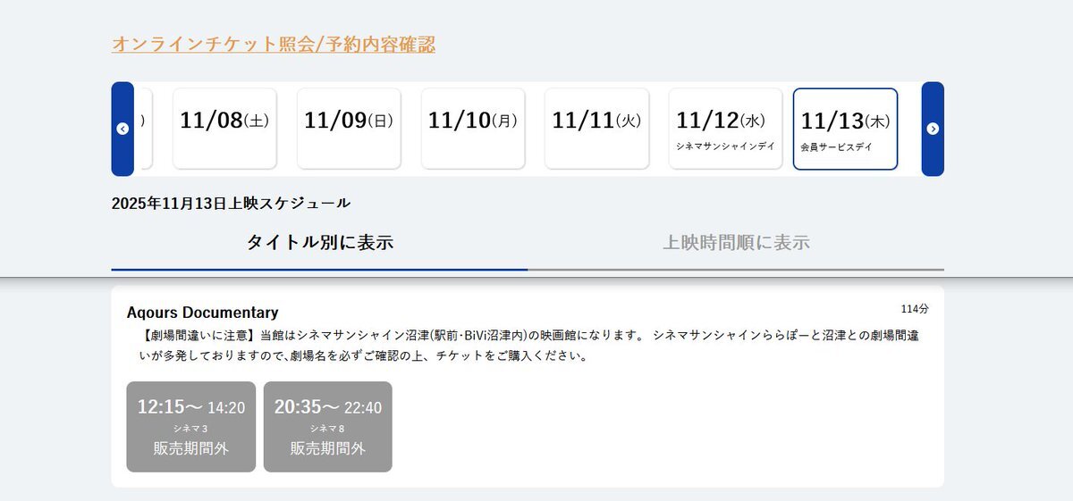 シネマサンシャイン沼津、現時点で確認できる一番先の11/13もまだ『Aqours Documentary』がある。今観れる映画館は日本全国でもうここだけだから。じもあいだなあ…。いつ頃まで上映してくれるんだろう。 #AqoursDocumentary感想 pic.x.com/GC7VDcM5S3