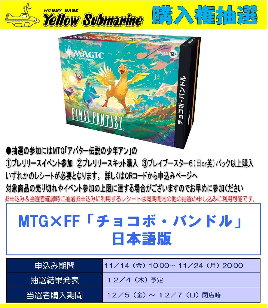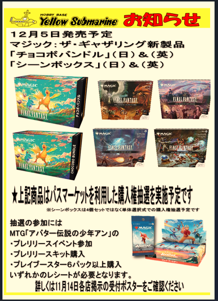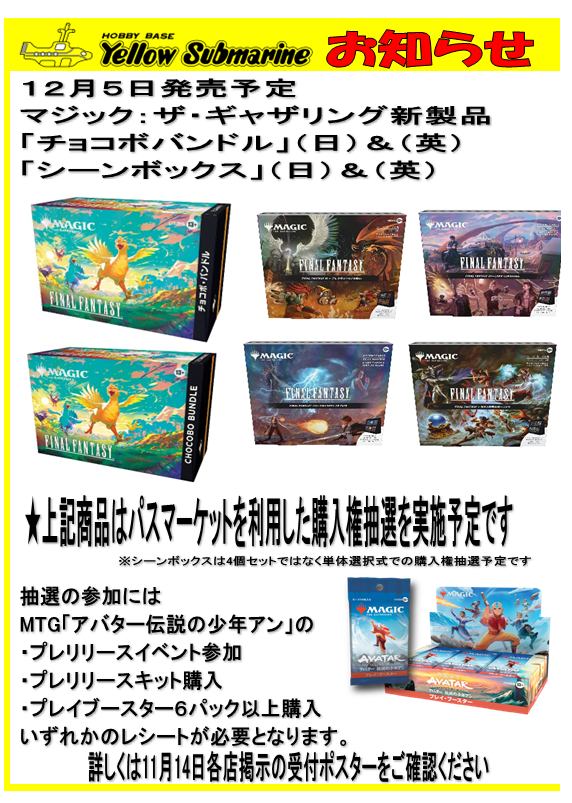 イエローサブマリン名古屋GAMESHOP 12月5日発売 MTG×FF「チョコボバンドル」&「シーンボックス」 パスマーケットを利用した購入権抽選を実施中。当選者が購入する事ができます。詳しくは店内掲示のポスターのQRコードよりお申込みページへ。 #イエサブ #MTG #MTGxFinalFantasy pic.x.com/2GLqhQeb0l