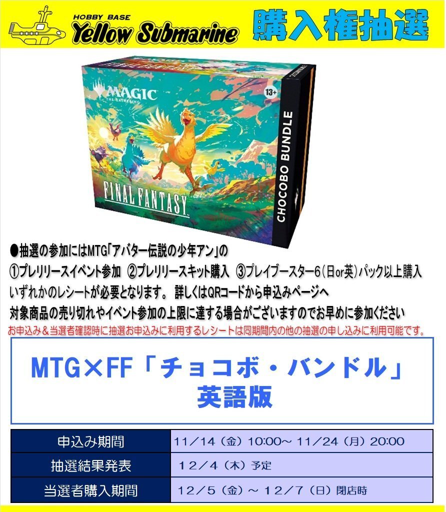 【#MTG 抽選】#新宿 #イエローサブマリン 12月5日発売 「チョコボバンドル」 「シーンボックス 各種」 申込期間:11/14(金)~11/24(月) 購入権の抽選を実施中です! 申込の際に条件や注意事項がございますので、ページをよくお読みの上ご応募ください! 応募用ポスターは入口すぐに掲示しています! pic.x.com/FXqmwqQF1m