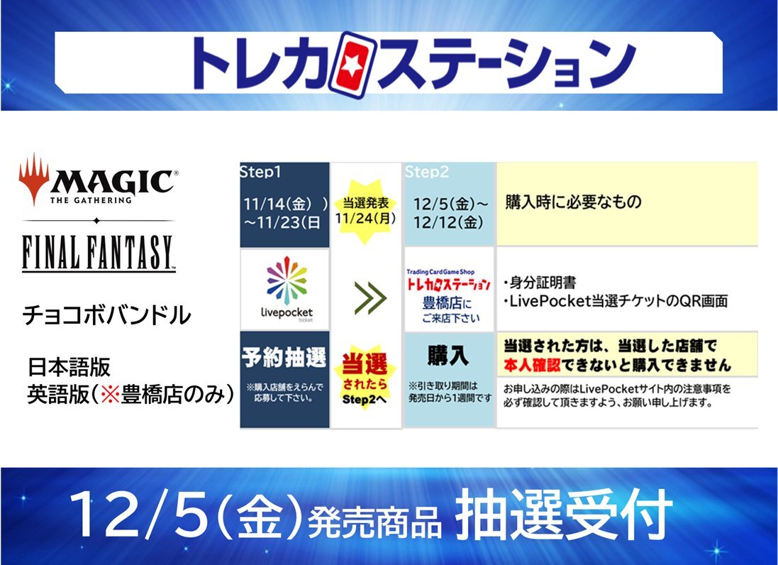 #トレカステーション豊橋店 #MTG 📢12/5(金)発売 【マジック:ザ・ギャザリング——FINAL FANTASY】 チョコボバンドル(日/英) Livepocketによる予約抽選受付となります。 📝お一人様1点まで ✅応募期間:2025年11月23日23:59まで ✅当選発表:11月24日(月) 店頭掲示のQRコードよりご応募ください🎶