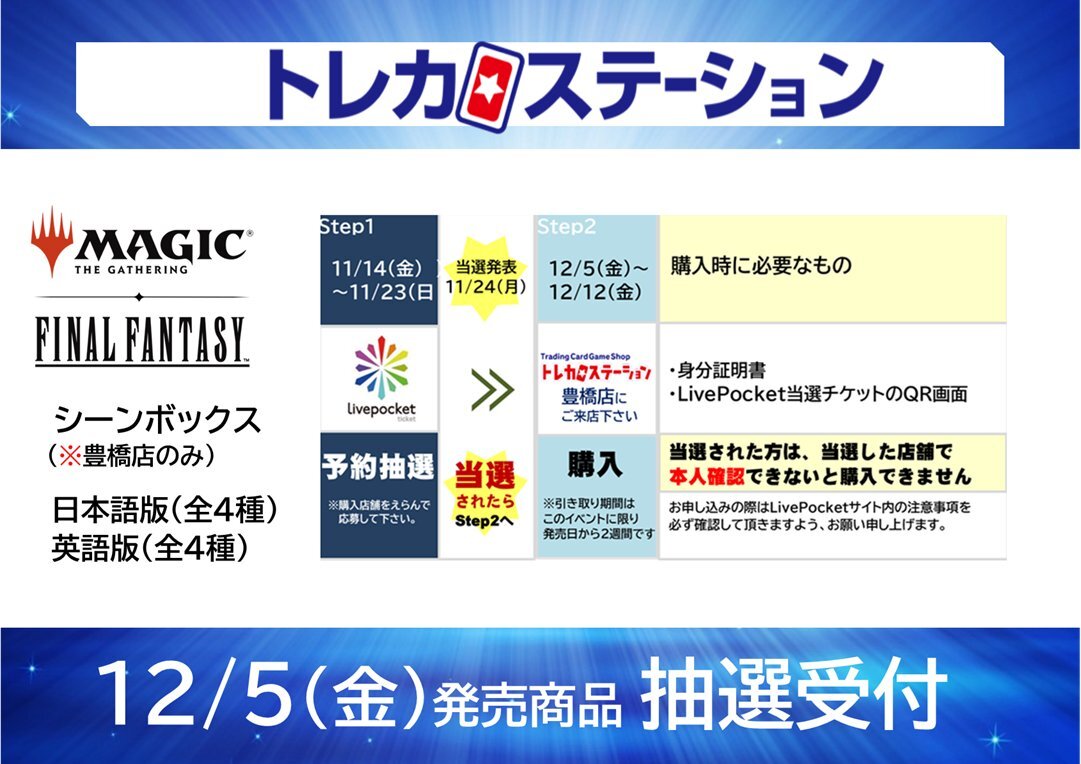 #トレカステーション豊橋店 #MTG 📢12/5(金)発売 【マジック:ザ・ギャザリング——FINAL FANTASY】 📝シーンボックス(日/英)各4種 x.com/TRSTtoyohashi/… 📝チョコボバンドル(日/英) x.com/TRSTtoyohashi/… 店頭掲示のQRコードより Livepocket予約抽選受付中🎶 応募期間:2025年11月23日23:59まで pic.x.com/Sv4nUa5fy7