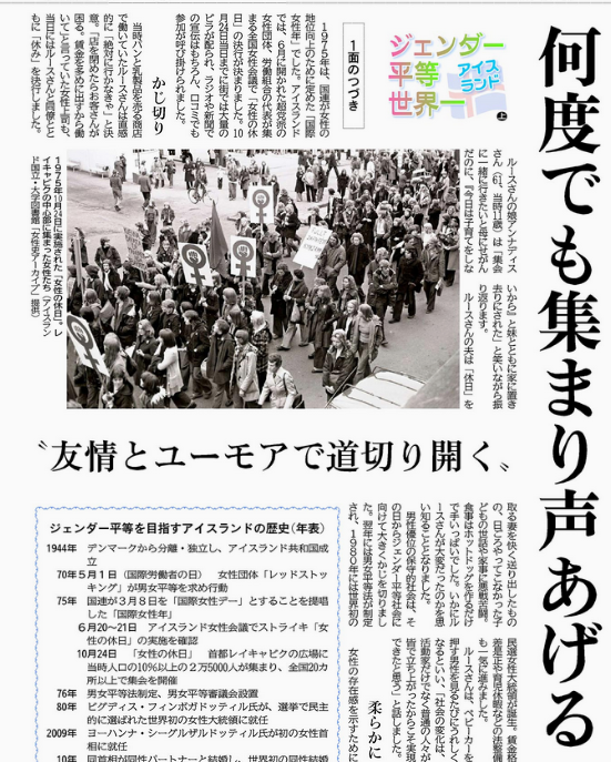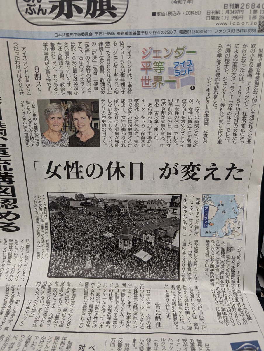 今日の赤旗1面、特集アイスランド。 ジェンダーギャップ指数で16年連続1位を獲得したアイスランド、契機は女性の社会的地位向上を求めた「女性の休日」。 女性9割が参加、商店・工場・保育園・学校は一斉に休み、家の洗い物も放置、女性不在で社会と家庭が機能しないことを証明。 #日本共産党 pic.x.com/3YPGm8JHf9