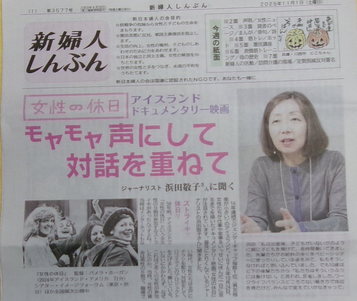 1))新婦人しんぶん2025年11月1日号にジャーナリストの浜田敬子さん登場。ジェンダーギャップ指数16年連続1位のアイスランドの取り組み、話題の『女性の休日』について1面と2面で縦横に語る。「取材を通してわかったのは、ジェンダー平等への第一歩が『女性の休日』から始まったとしても、その後の➡続 pic.x.com/7FMJF1b8KW