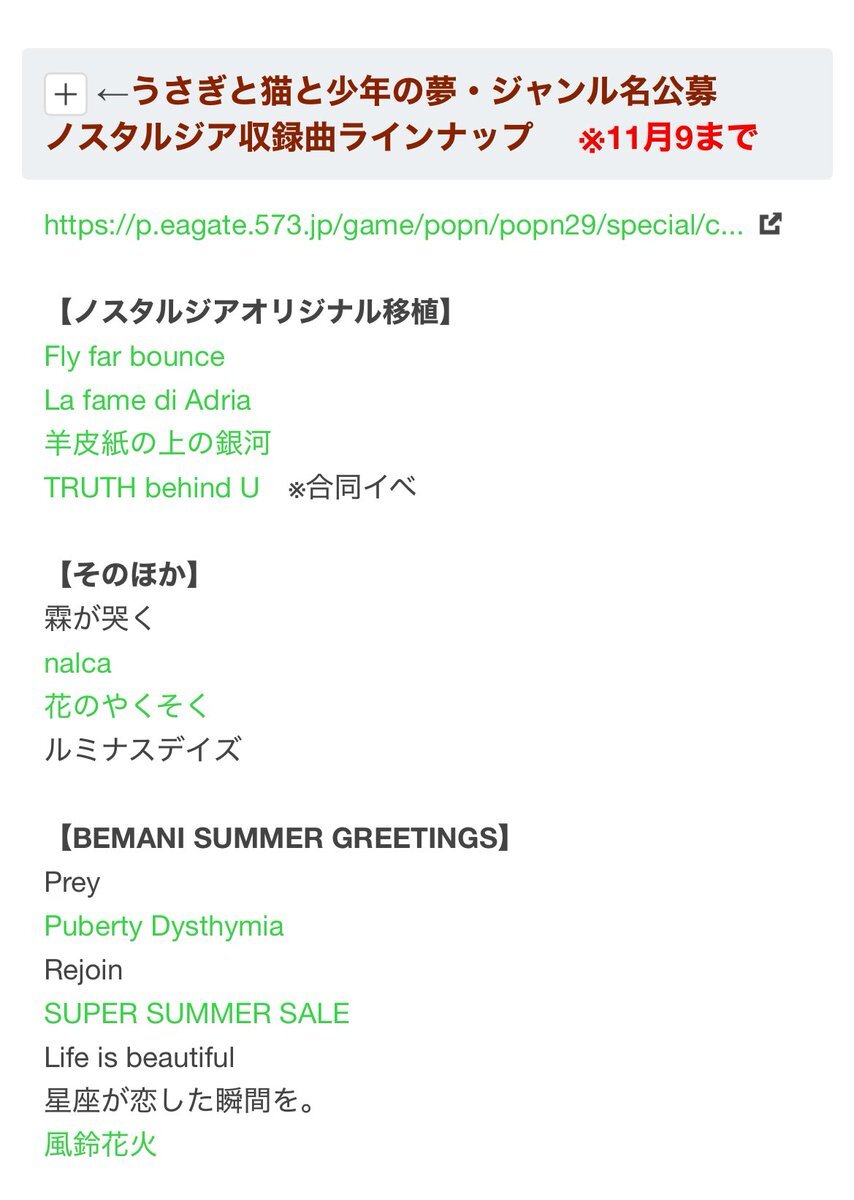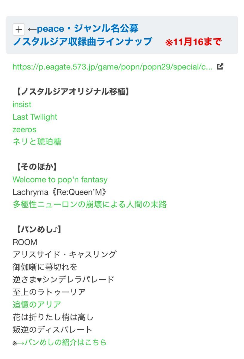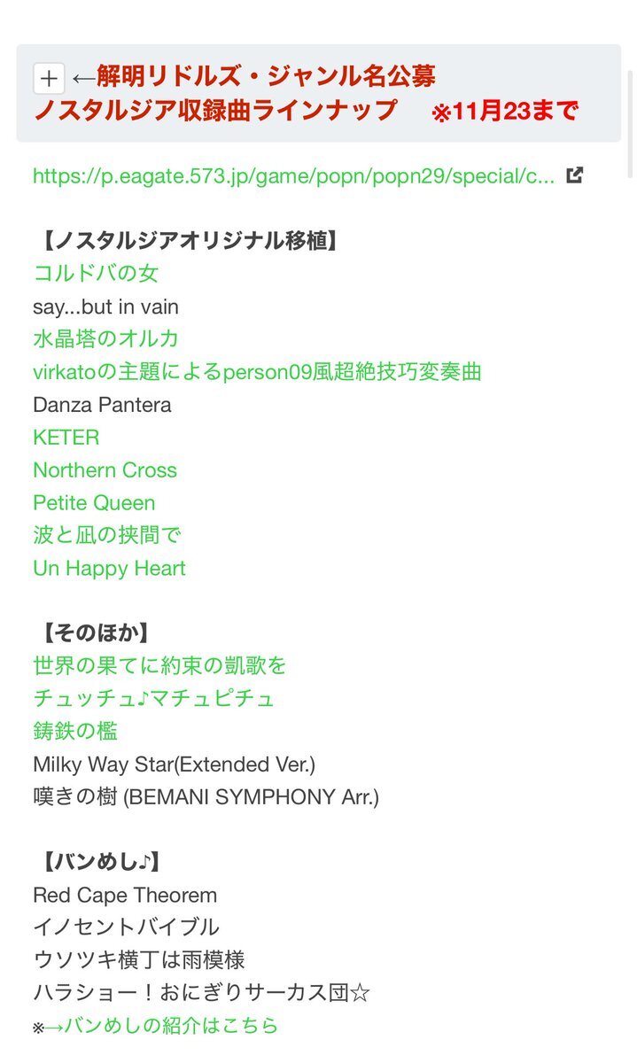 【ジャンル名公募リドルズ編】〜11/23 #ノスタルジア 関連 Danza Pantera KETER Northern Cross Petite Queen 波と凪の挟間で say...but in vain Un Happy Heart virkatoの主題によるperson09風超絶技巧変奏曲 コルドバの女 水晶塔のオルカ 他画像参照 ジャンル名まとめ↓ seesaawiki.jp/nstl/d/%A5%B8%… pic.x.com/khpvfkB3yw x.com/popn_team/stat…
